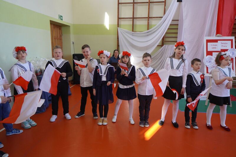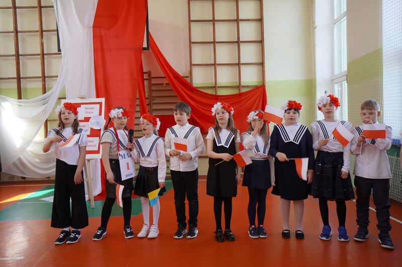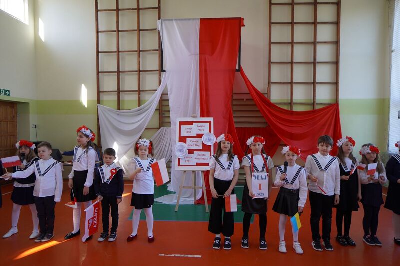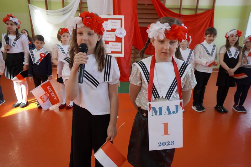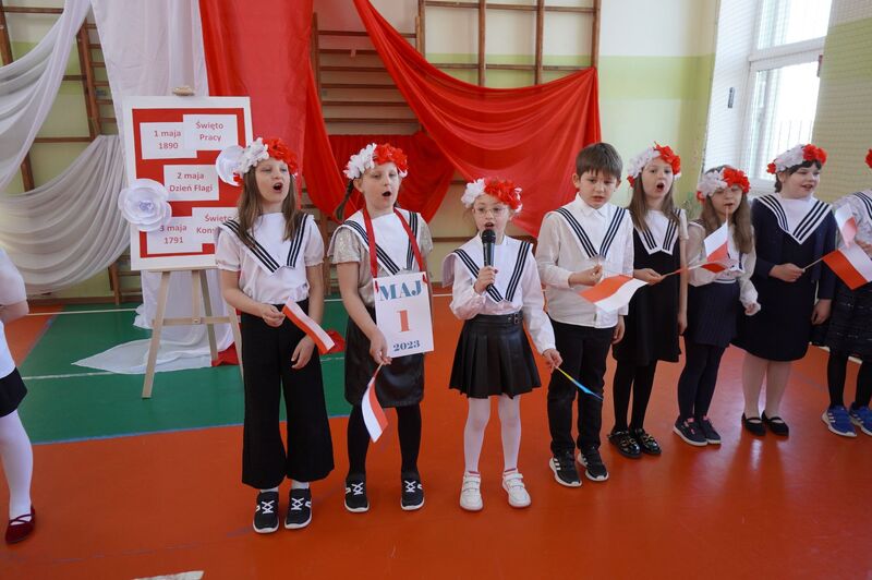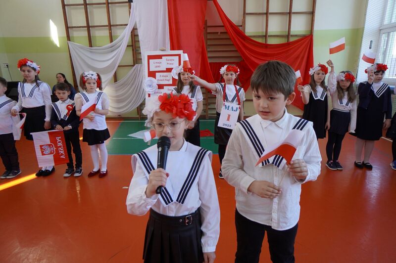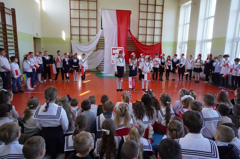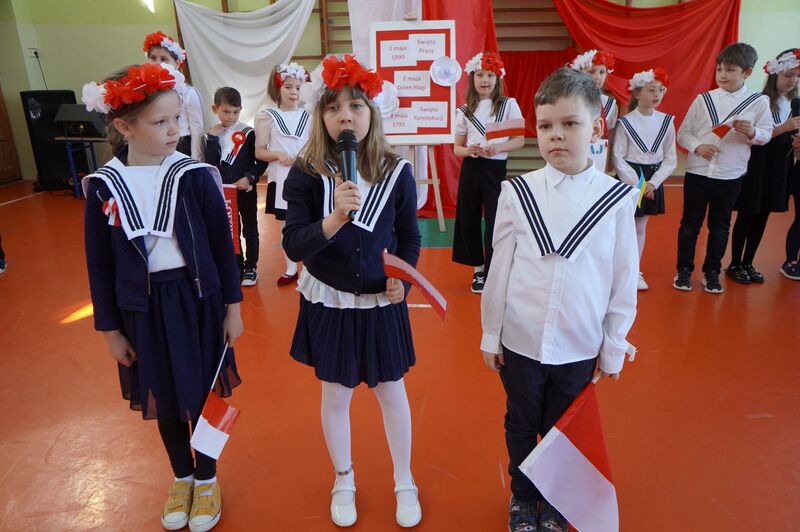 Z okazji świąt majowych uczniowie z klasy 2A i 2C przygotowali uroczysty apel dla klas I-III. Dzieci przybliżyły rówieśnikom historyczne wydarzenia i opowiedziały, dlaczego obchodzimy Święto Pracy, Dzień Flagi Rzeczpospolitej Polskiej oraz Święto Narodowe Trzeciego Maja.