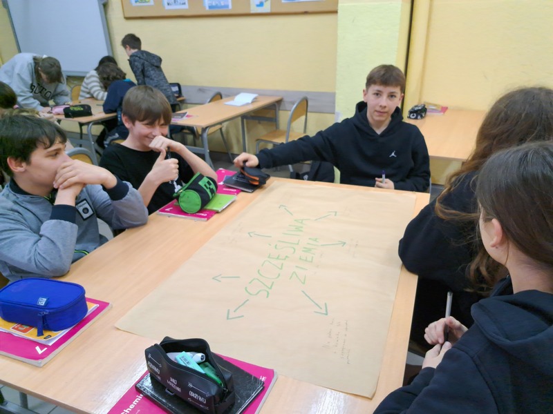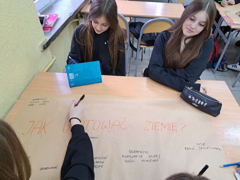 Na lekcjach uczniowie pracowali w grupie nad plakatami nt. „Jak uratować Ziemię?”, a następnie omawiali je.