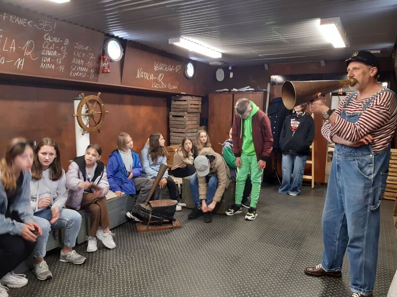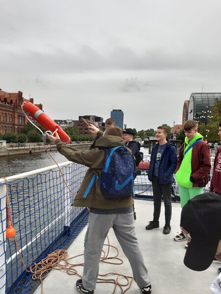 Najpierw zwiedziliśmy Stary Rynek z ratuszem, gdzie podzieleni na grupy graliśmy w grę miejską, poznając historię i zabytki Bydgoszczy. Zachwyciły nas Spichrze nad rzeką i Stary Port, dawniej tętniący życiem rzeczny port przeładunkowy. To właśnie to miejsce porównywane jest do Amsterdamu. Weszliśmy na pokład Barki Lemara, w której mogliśmy zobaczyć trzy ładownie i mieszkanie barkarskiej rodziny sprzed stu lat. Zmierzyliśmy się tam w przeciąganiu liny oraz rzucaliśmy koło ratunkowe do rzeki.
