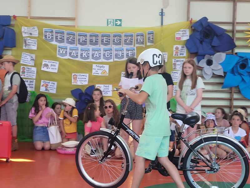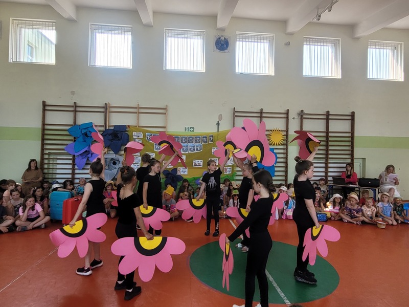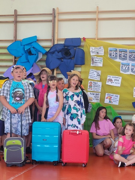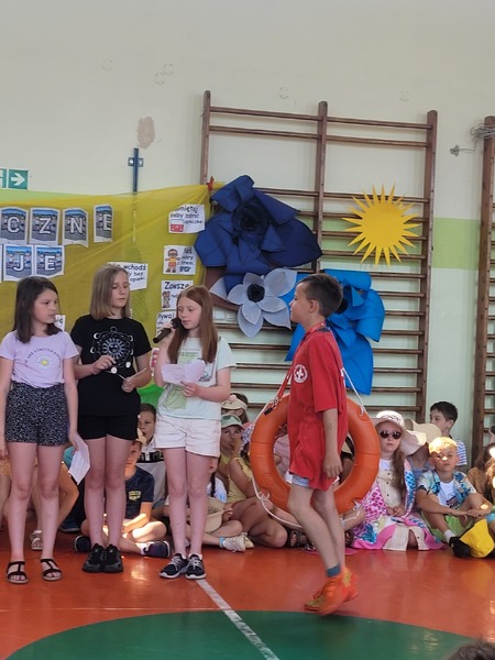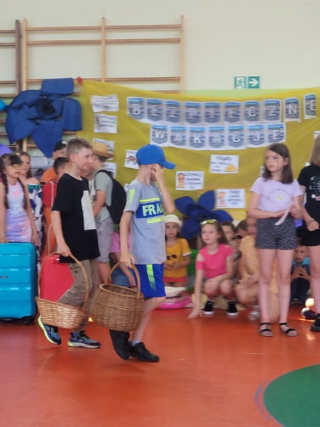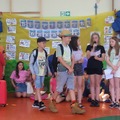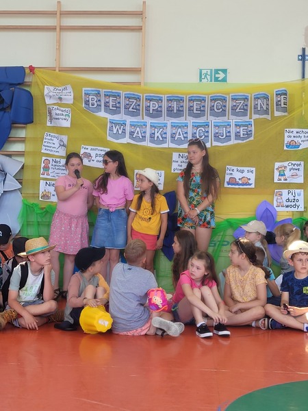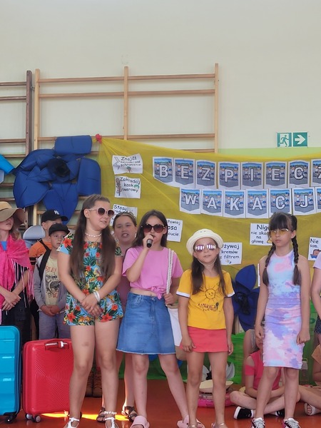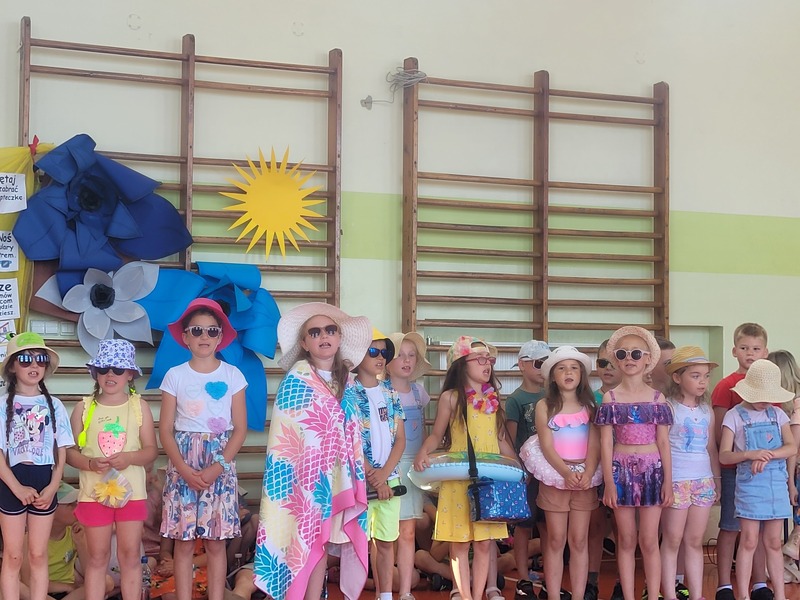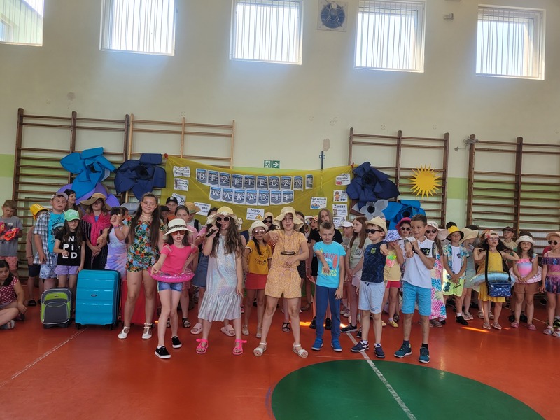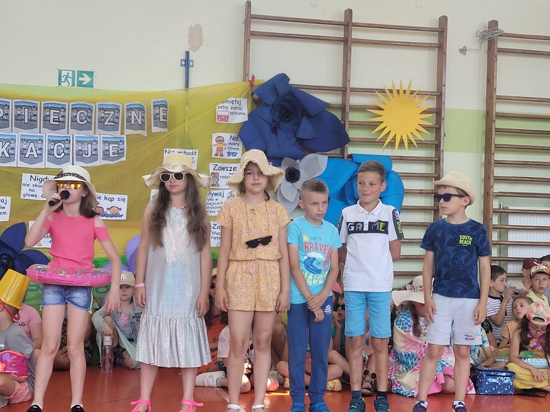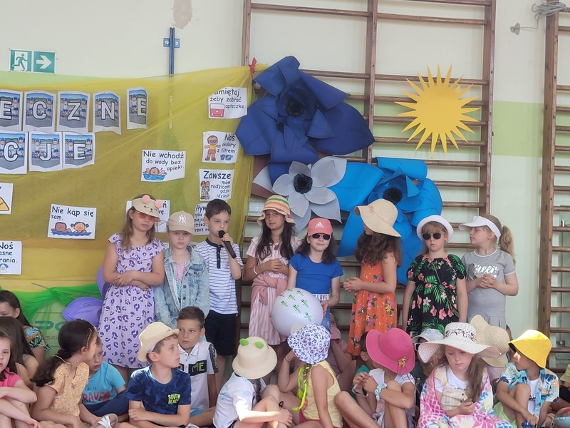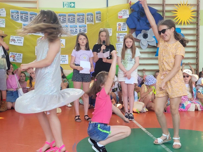 We wtorek 20 czerwca br. uczniowie klas: 1C, 1D, 2B, 2D, 3D i 3E pod kierunkiem wychowawczyń zaprezentowali swoje umiejętności podczas apelu na temat wakacji i zasad bezpiecznego spędzania czasu wolnego. W wierszach, piosenkach i tańcu dzieci zachęcały koleżanki i kolegów do spędzania wakacji w taki sposób, by odpocząć, pozwiedzać, poznać nowe miejsca i nawiązać nowe przyjaźnie. Mówiono także o tym, by jednocześnie zachowywać się w sposób bezpieczny i w dobrym zdrowiu powrócić do szkoły po wakacjach.