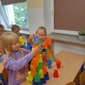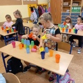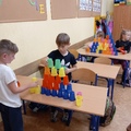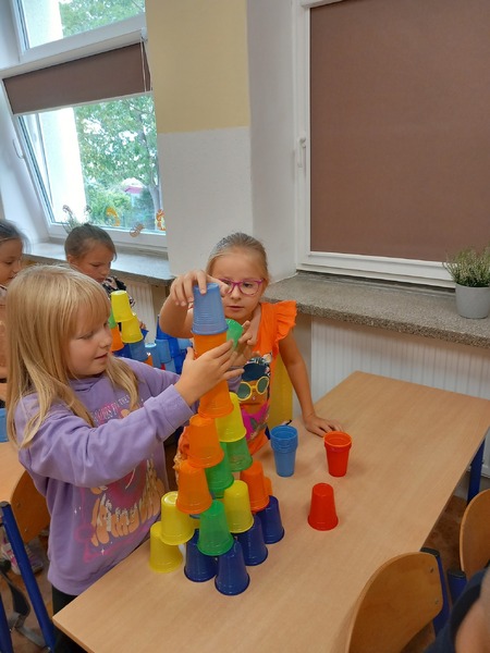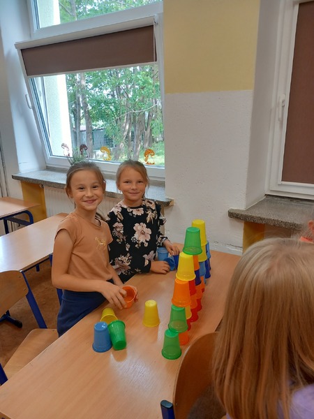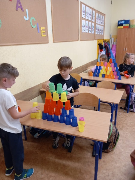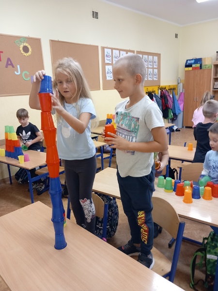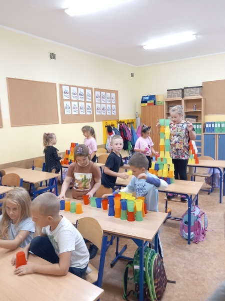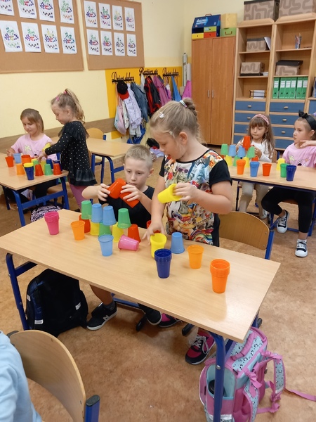 Pierwsze zajęcia z kodowania w klasie 1a. W roli głównej kolorowe kubeczki.