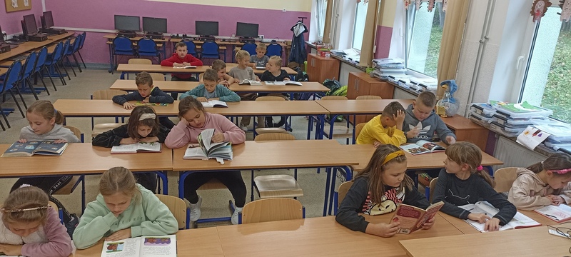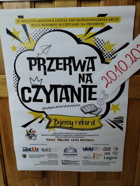 20 października 2023 r. - uczniowie, nauczyciele i pracownicy naszej szkoły wzięli udział w IV Międzynarodowej edycji VIII Ogólnopolskiej akcji bicia rekordu w czytaniu. Jesteśmy jedną z placówek uczestniczących w przedsięwzięciu realizowanym w ramach Międzynarodowego Miesiąca Bibliotek Szkolnych oraz kampanii społecznej „Cała Polska czyta dzieciom”. Do wspólnego czytania zaprosiliśmy rodziców i dziadków naszych uczniów. Czytaliśmy książki przyniesione z domu lub wypożyczone z biblioteki szkolnej. Nasz wynik to 675 osób czytających w danym czasie. Brawo!