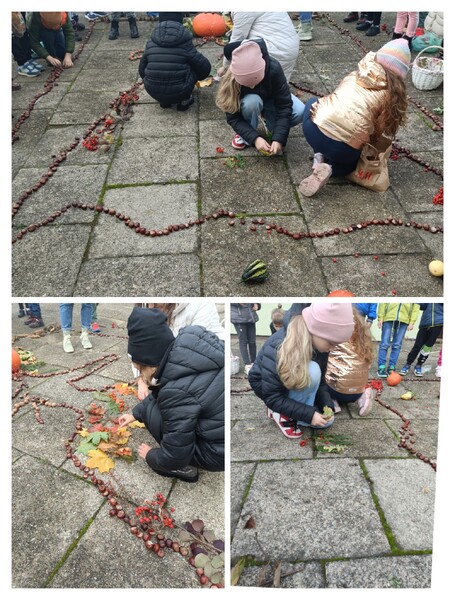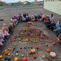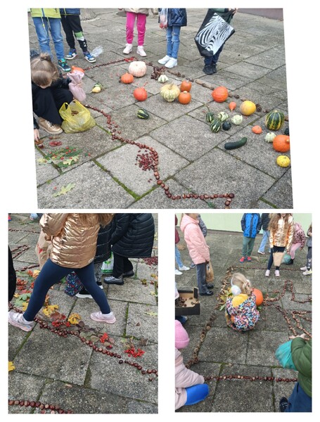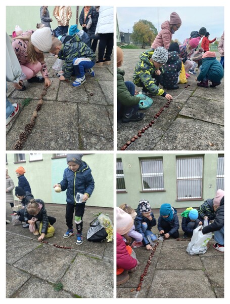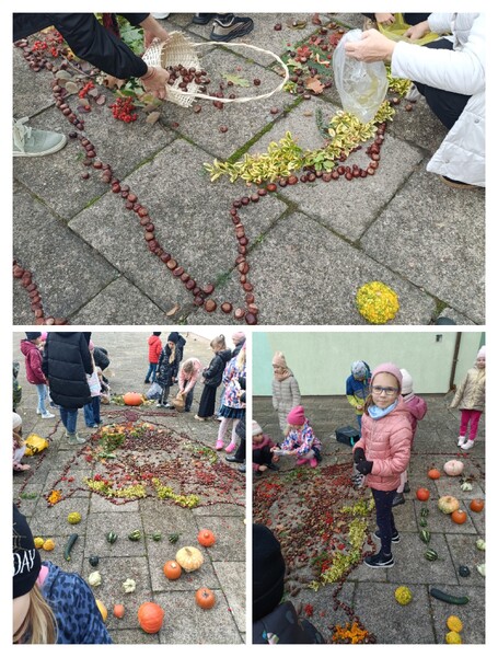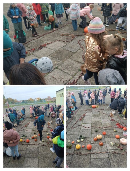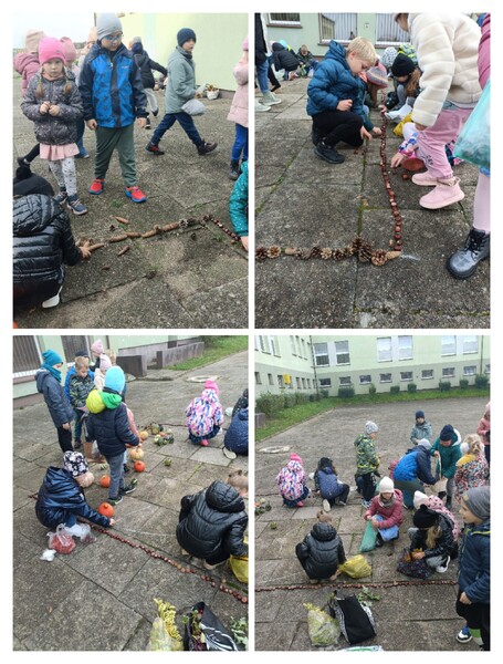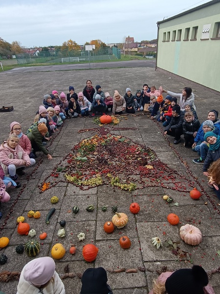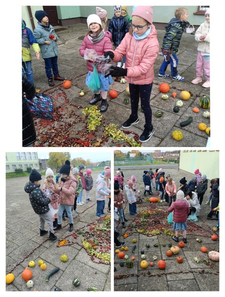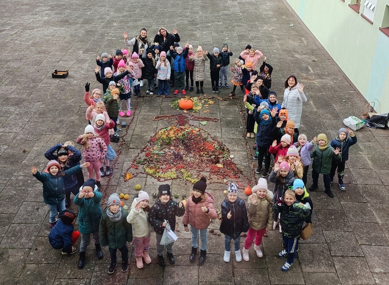 Ogólnopolski projekt „Klasa w terenie”, w którym biorą udział klasy pierwsze naszej szkoły ma na celu realizację różnych aktywności na świeżym powietrzu. Okienko pogodowe w poniedziałek 30.10.23 r. pozwoliło klasom 1b, 1c i 1d wykonać kolejne zadanie projektowe jakim była „Plastyka w terenie - wykonanie prac z darów natury”. Uczniowie z przyniesionych darów natury stworzyli przepiękną Panią Jesień. Dzieci uwielbiają taki rodzaj aktywności.