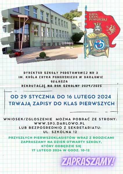 Szkoła Podstawowa nr 3 w Darłowie od 29 stycznia 2024 r. rozpoczyna rekrutację uczniów do klas I na rok szkolny 2024/2025.