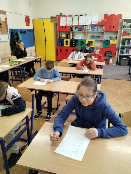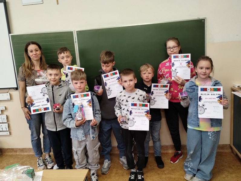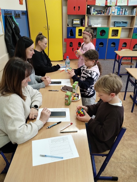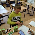 Uczniowie klas I-V rozwiązywali test wiedzy dotyczący historii Kostki Rubika, a następnie układali kostkę w określonym czasie. Uczestnicy konkursu wykazali się nieszablonowym myśleniem, umiejętnością logicznego myślenia oraz rozwijali wyobraźnię przestrzenną.