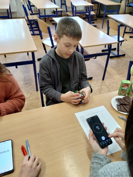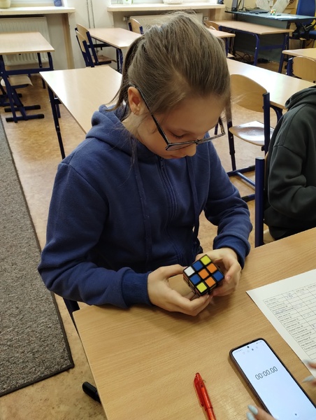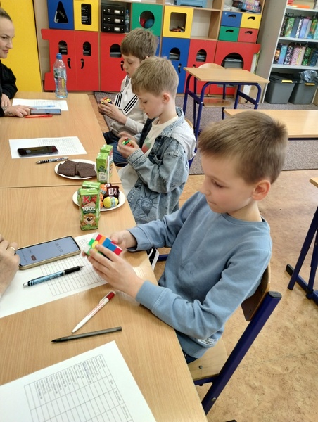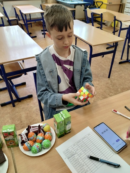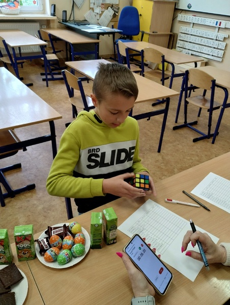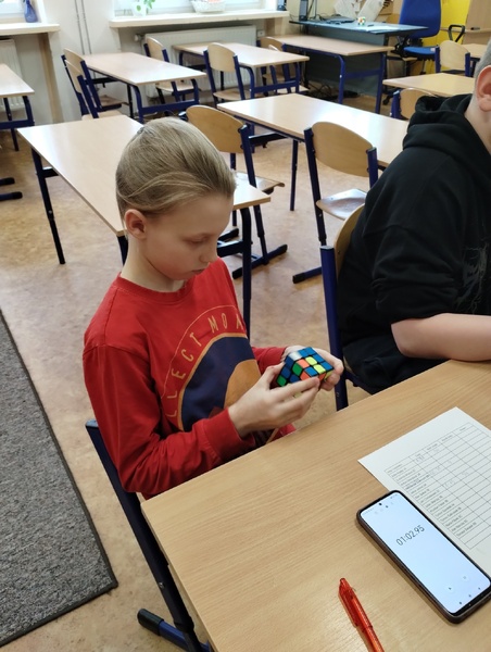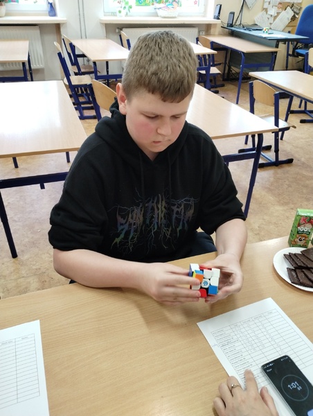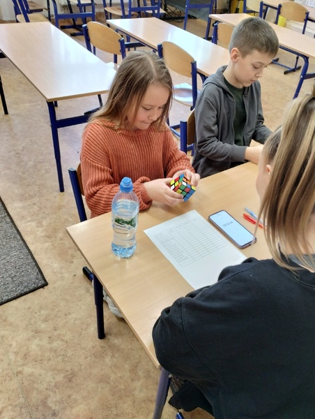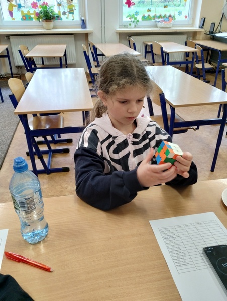 Rekord ułożenia Kostki Rubika ustanowił Alan Sołtan z klasy 3E z czasem 51 sekund.