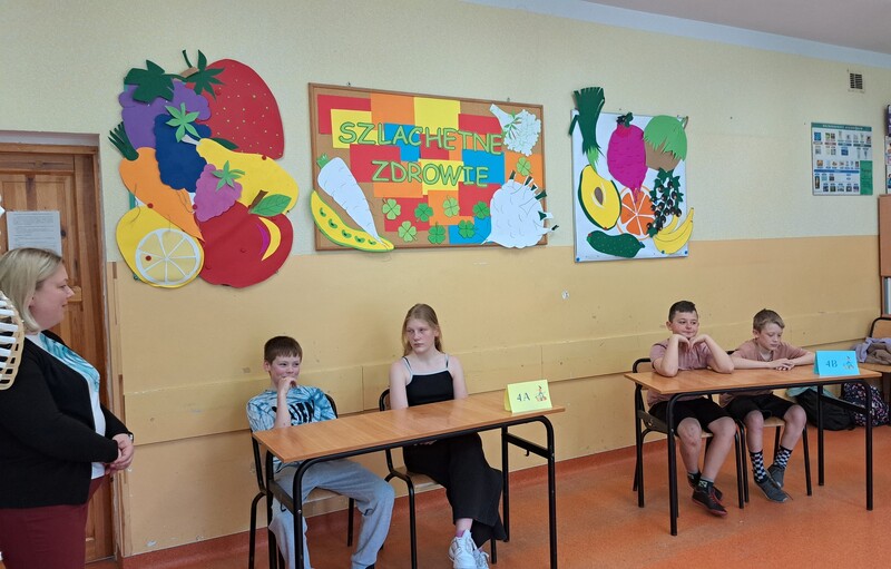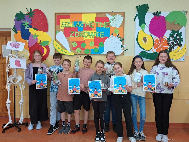 W ostatnim tygodniu kwietnia odbył się po raz kolejny konkurs klas 4-tych „Szlachetne zdrowie”. Jego celem było poszerzenie wiedzy z zakresu działań prozdrowotnych – właściwego sposobu odżywiania, propagowania zasad zdrowego stylu życia, promowania urozmaiconej w warzywa, owoce i inne cenne składniki codziennej diety i jej pozytywnego wpływu na zdrowie człowieka oraz profilaktyki chorób i właściwego postępowania w sytuacjach zagrożenia zdrowia i życia.