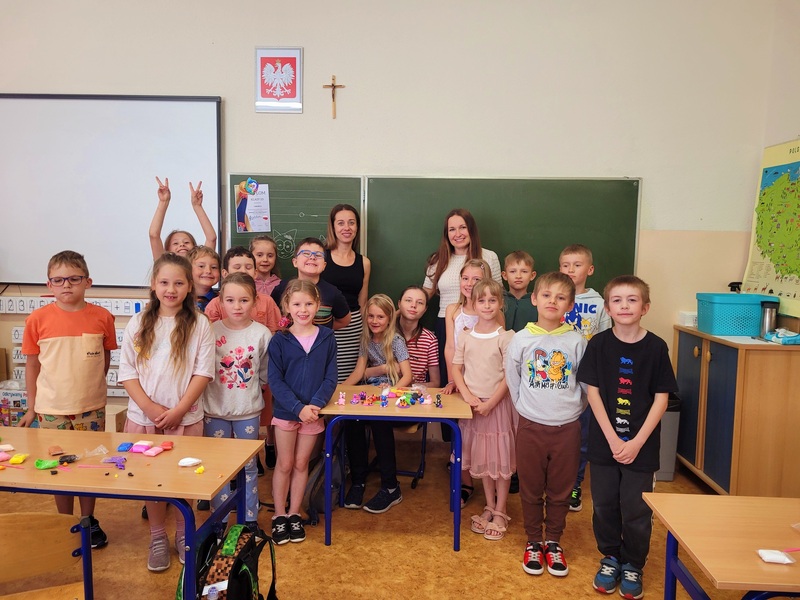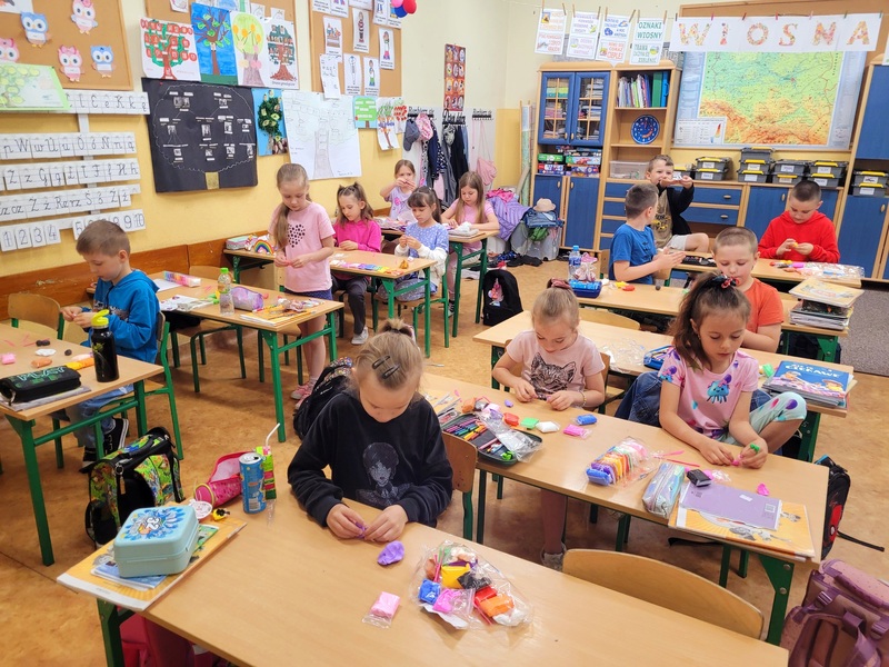 Dnia 27 maja 2024r. uczniowie i wychowawcy klas: 2C, 1B i 1D zaprosili na zajęcia lekcyjne absolwentkę naszej szkoły - Zosię Kisielewską. Dzieci poznały Zosię podczas wernisażu prac z piankoliny, który odbył się w kwietniu w Galerii Rybackiej i Marynistycznej SKŁO 44. Ponad 1000 figurek z piankoliny wykonanych przez Zosię zrobiły na odwiedzających wystawę tak duże wrażenie, że uczniowie wyrazili chęć spotkania z autorką prac podczas szkolnych warsztatów.