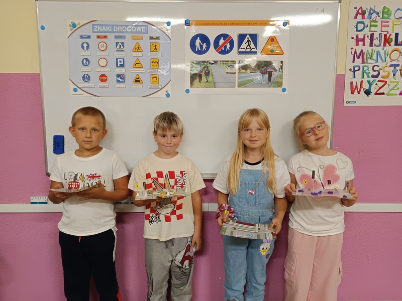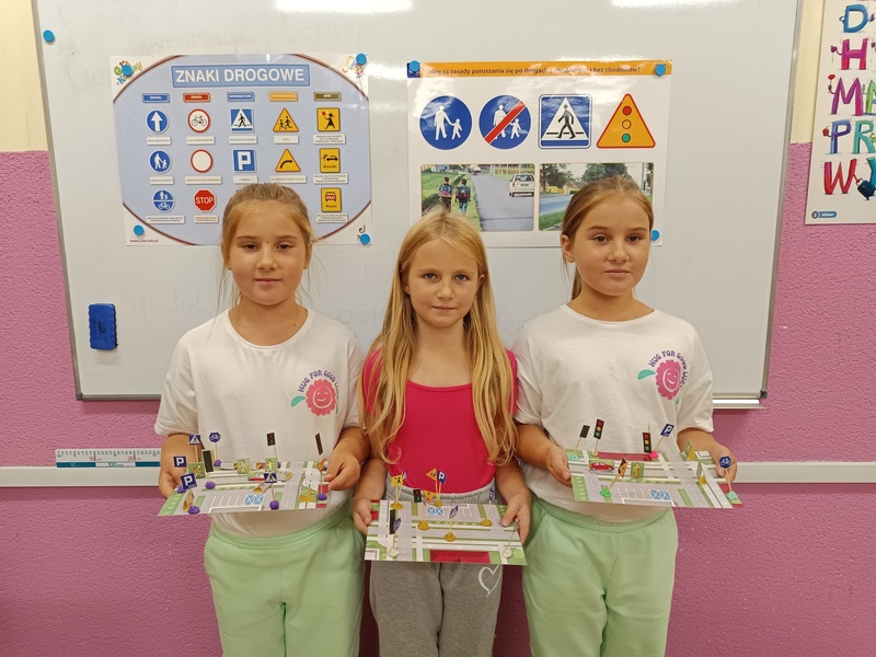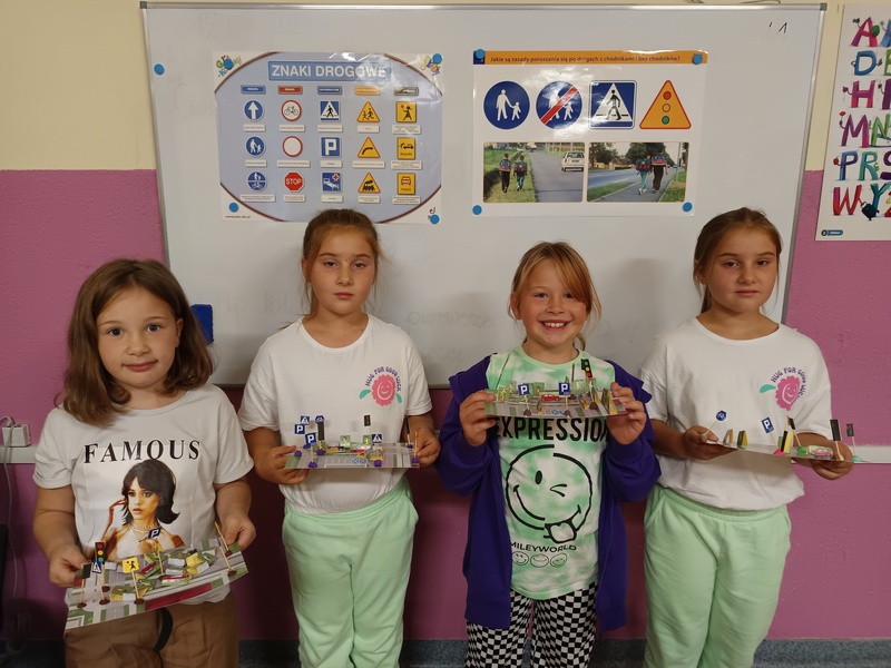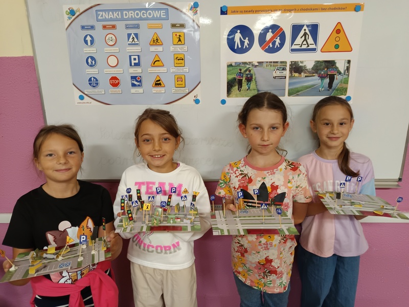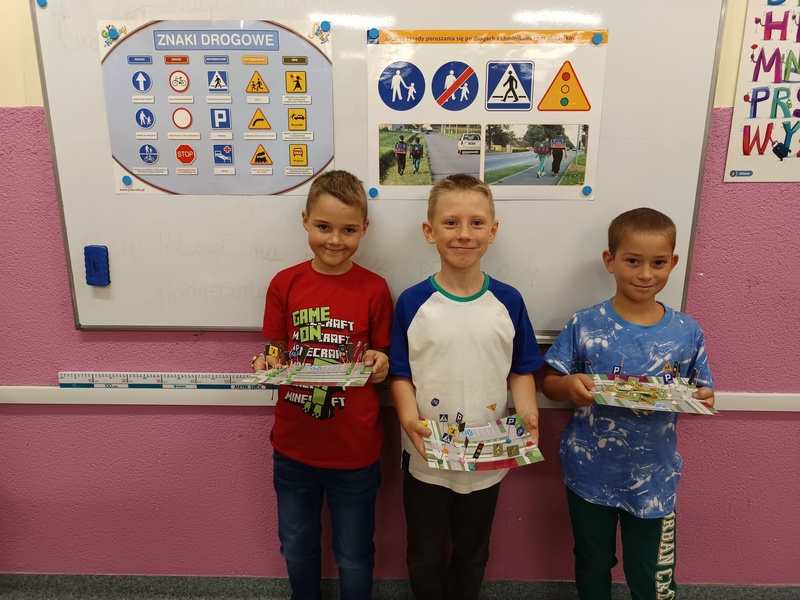 Uczniowie klasy 2A doskonale wiedzą jak bezpiecznie poruszać się na drodze, jakie zasady obowiązują podczas przechodzenia przez jezdnię oraz o czym informują nas podstawowe znaki drogowe. Aby przypomnieć i utrwalić te wszystkie ważne sprawy uczniowie wykonali makiety pt. „Ruch drogowy” oraz przeszli ważny „sprawdzian” praktyczny z prawidłowego przechodzenia przez jezdnię. Każdy uczeń wzorowo poradził sobie z zadaniem a osiągnięty sukces został nagrodzony dyplomem „Bezpiecznego Uczestnika Drogowego”.