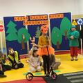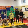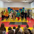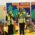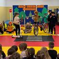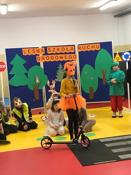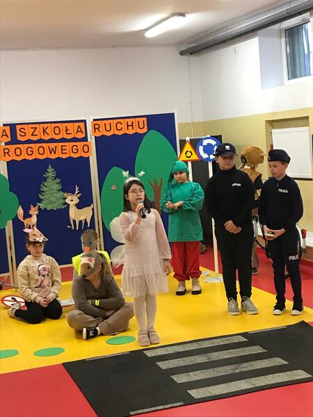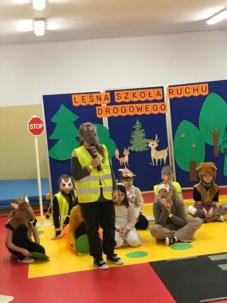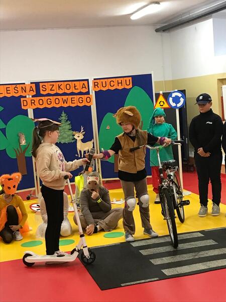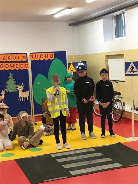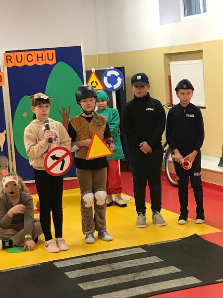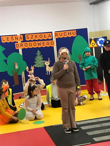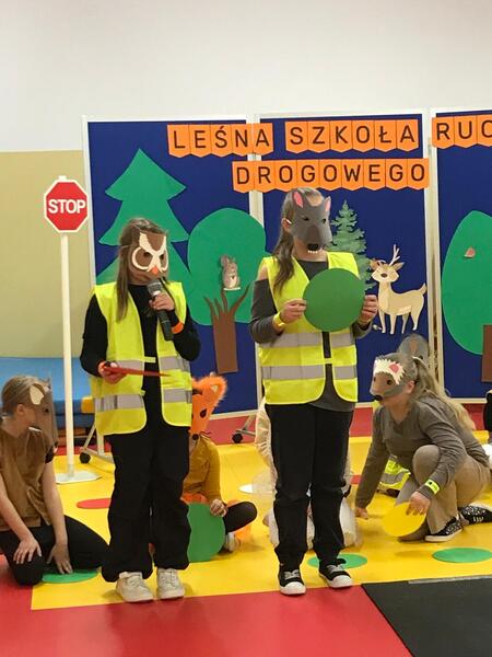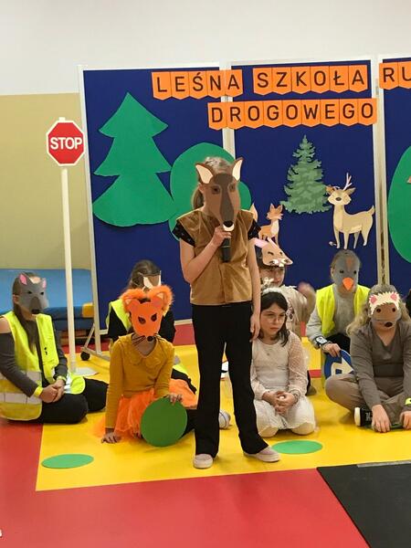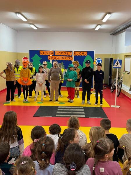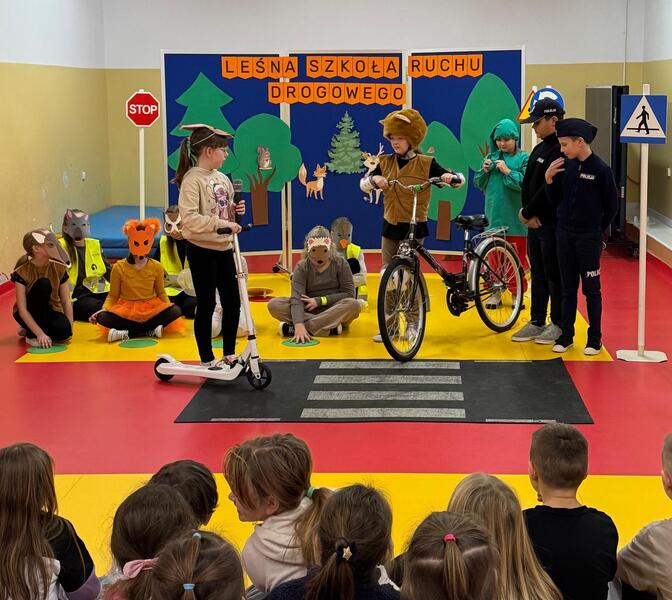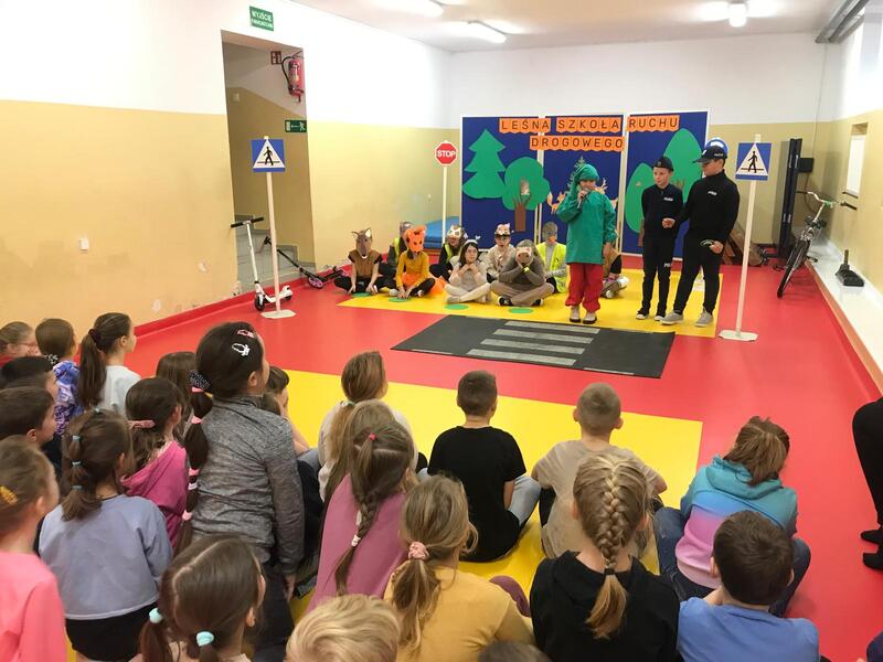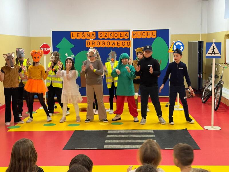 Uczniowie szkolnego koła teatralnego z kl. 3B, zaprezentowali swoje aktorskie umiejętności w przedstawieniu pt. „Leśna Szkoła Ruchu Drogowego”. Zwierzęta leśne, krasnal Hałabała oraz policjanci, w które to postaci wcielili się szkolni aktorzy, przypomnieli młodszym kolegom zasady ruchu drogowego. Utrwalali znajomość i znaczenie znaków drogowych w bezpiecznym poruszaniu się na jezdni, sygnalizatorów świetlnych oraz zwrócili uwagę na konieczność posiadania znaczków odblaskowych. W utrwaleniu zasad bezpieczeństwa na drodze, pomagały również dynamiczne, wesołe piosenki związane z tym tematem.