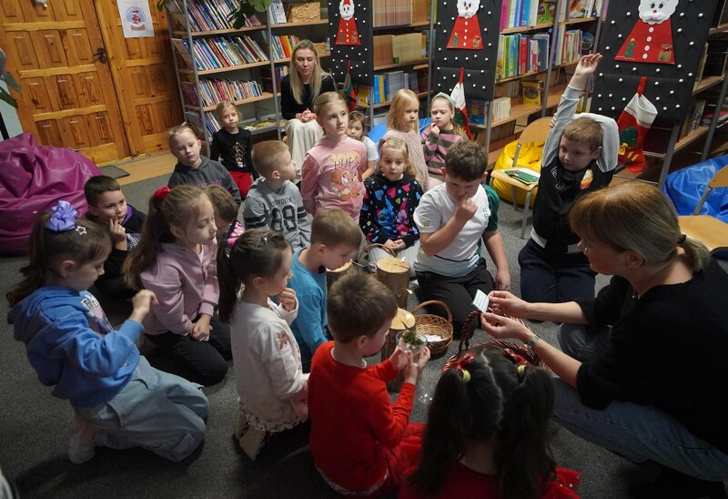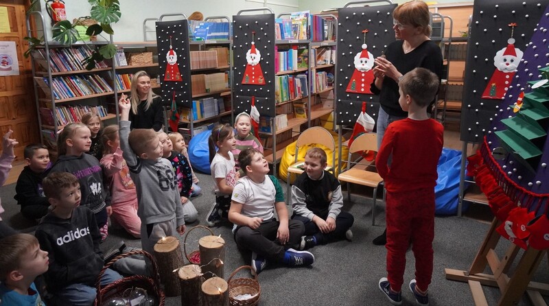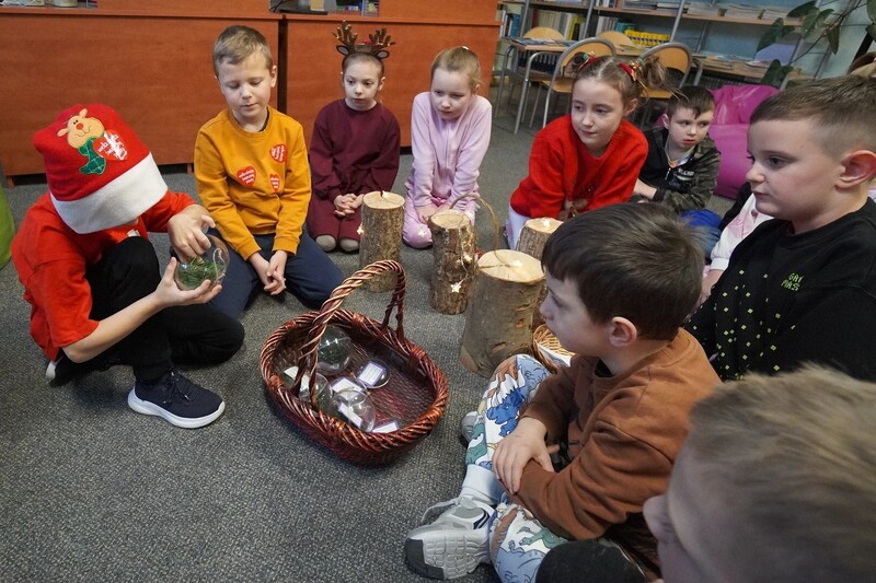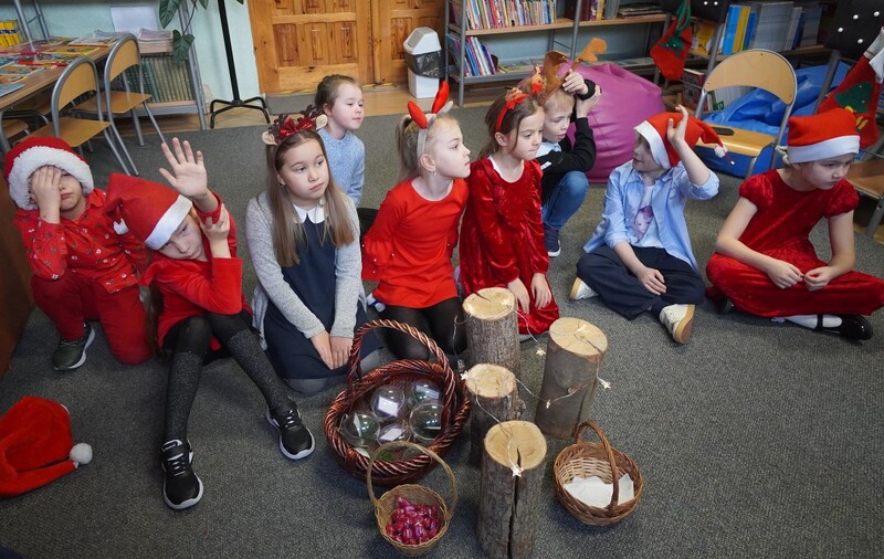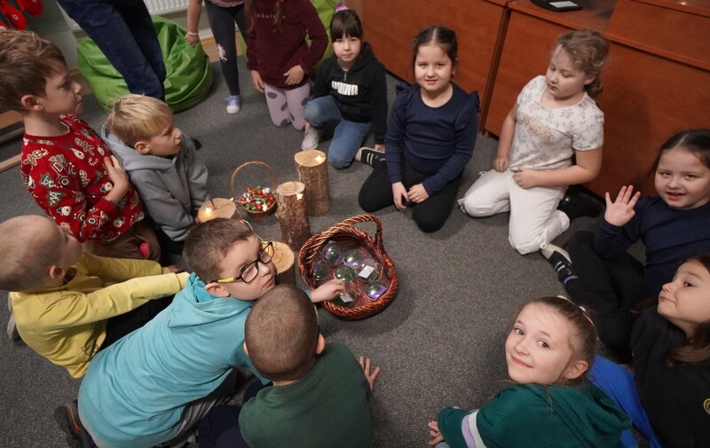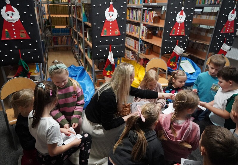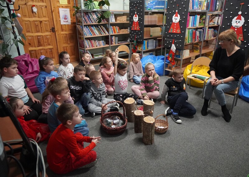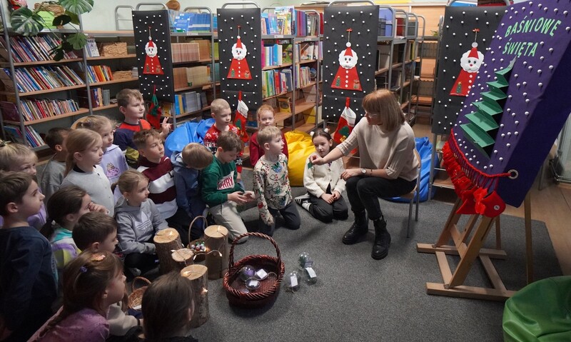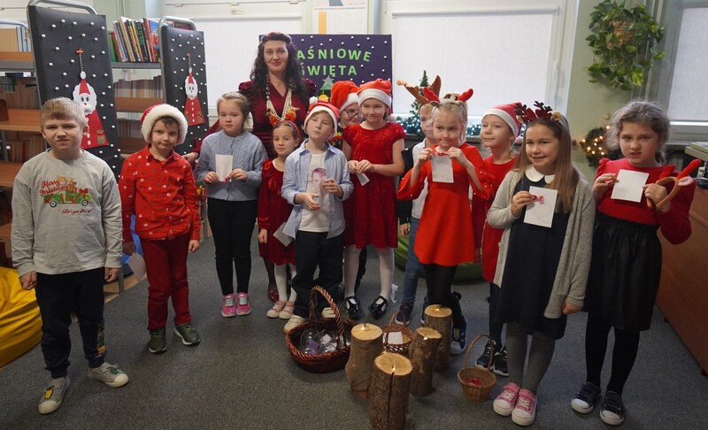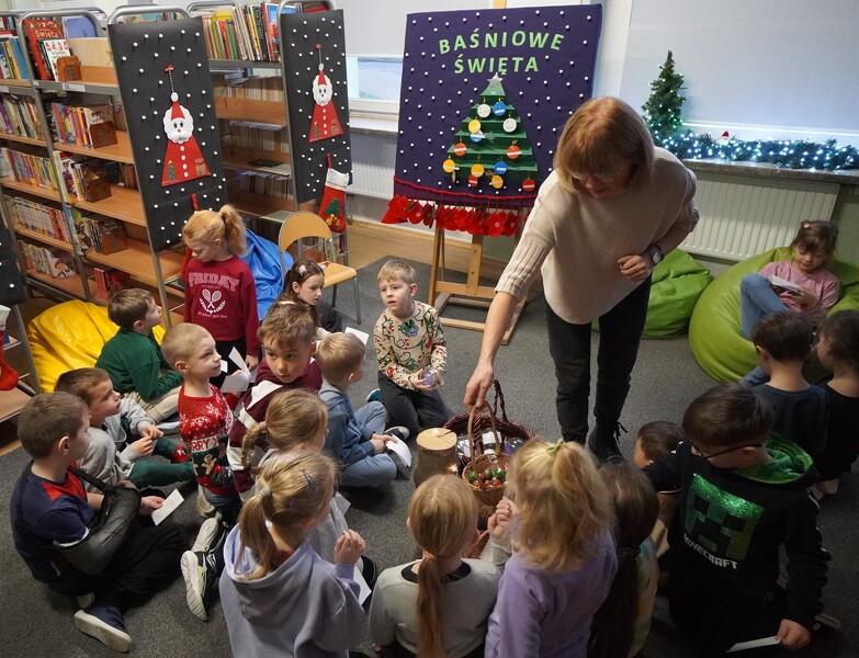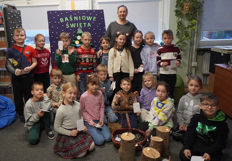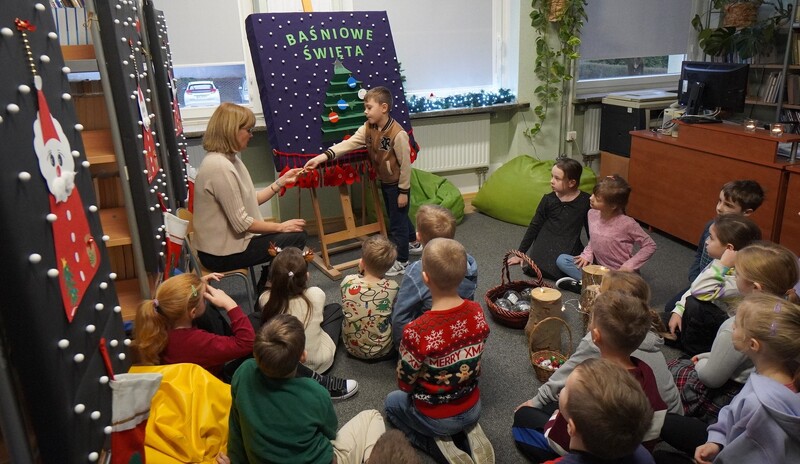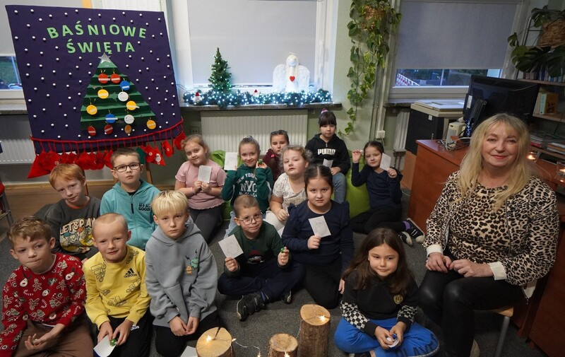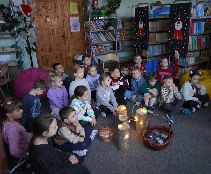 W dniach 16 – 19 grudnia w bibliotece szkolnej tradycyjnie, jak co roku, odbyły się spotkania z uczniami klas pierwszych i ich wychowawcami pod hasłem „Baśniowe święta”. Odświętnie udekorowana biblioteka w choinki, światełka, ciepły blask świec, mikołaje i płynące w tle kolędy wprowadziły uczniów w niecodzienny nastrój, który towarzyszył tym zajęciom. Dzieci wysłuchały bożonarodzeniowego opowiadania. Ponadto wzięły udział w zabawach i zadaniach ukrytych w „ozdobach świątecznych”, „adwentowych bucikach” oraz na „bajkowej choince”.
