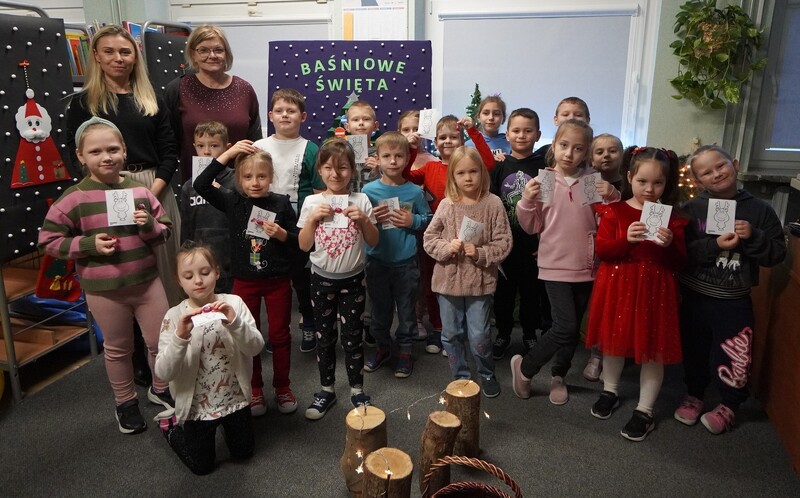 Na zakończenie spotkania dla każdego czekała miła niespodzianka. Słodycze i przygotowane na tę okazję „świąteczne kolorowanki”, które wręczyła Pani Dyrektor Joanna Koguciuk wywołały radość na buziach pierwszoklasistów.