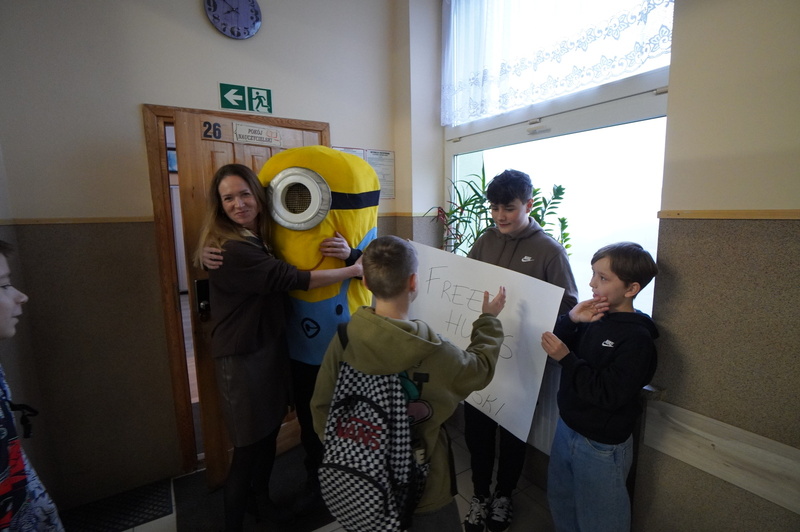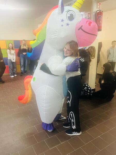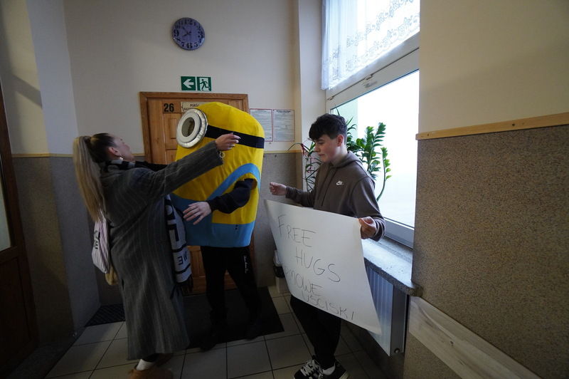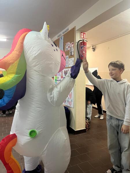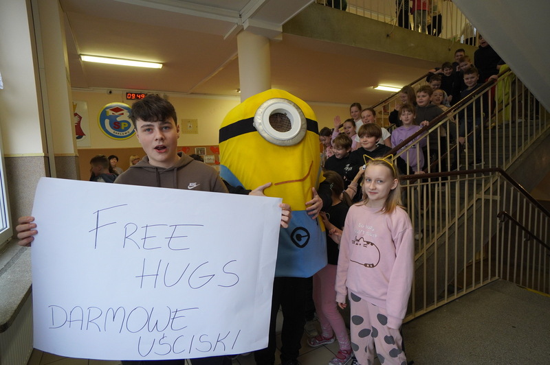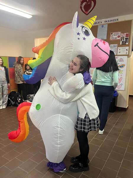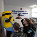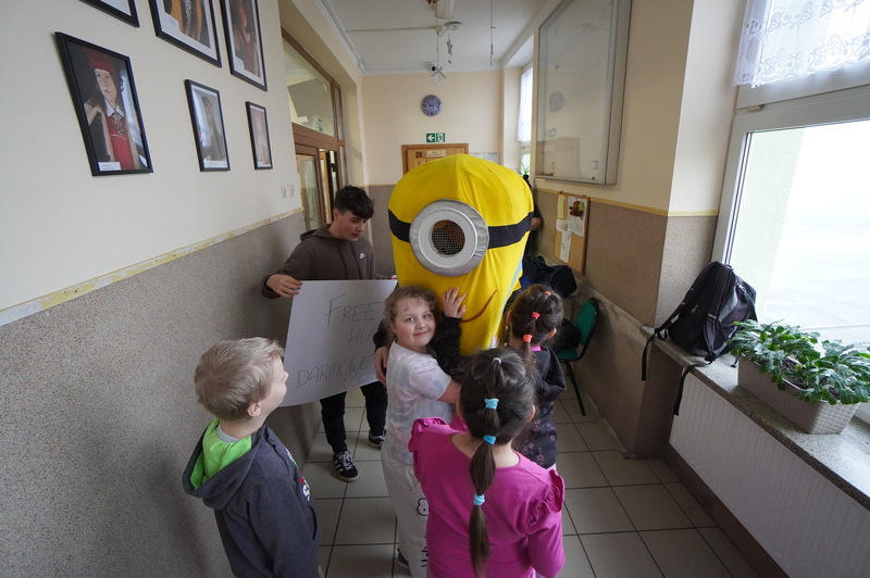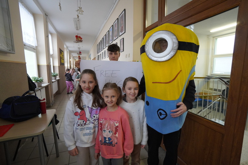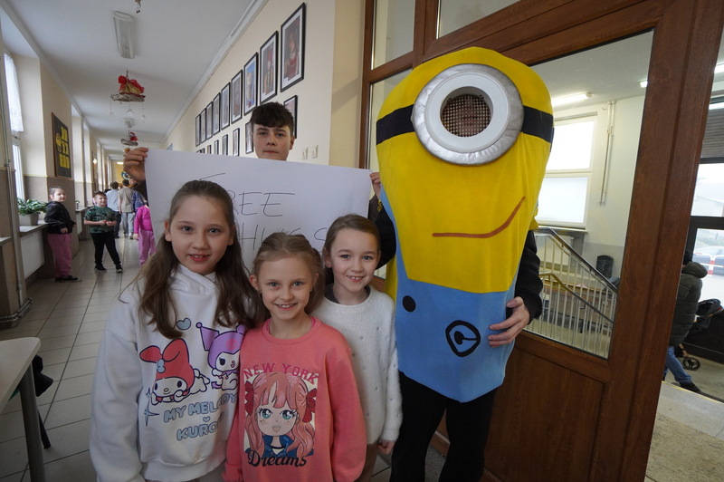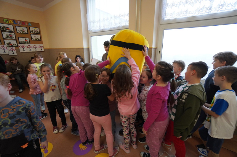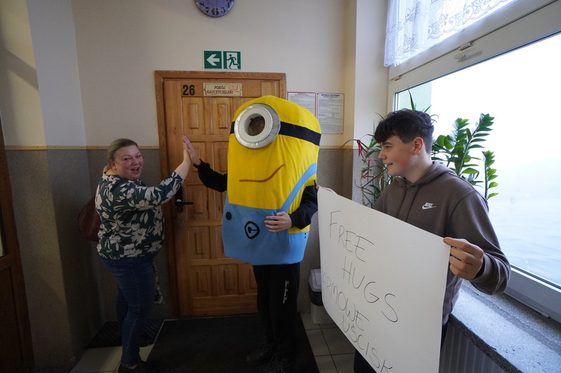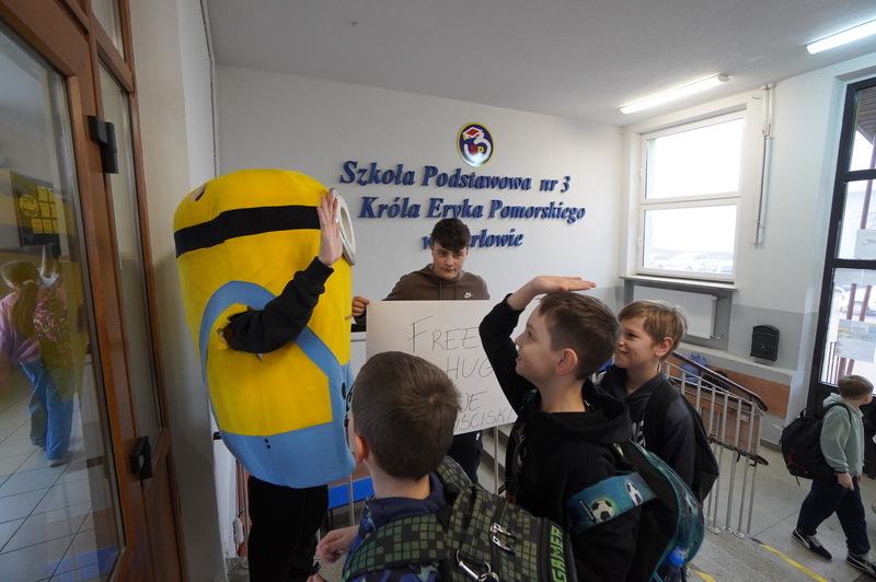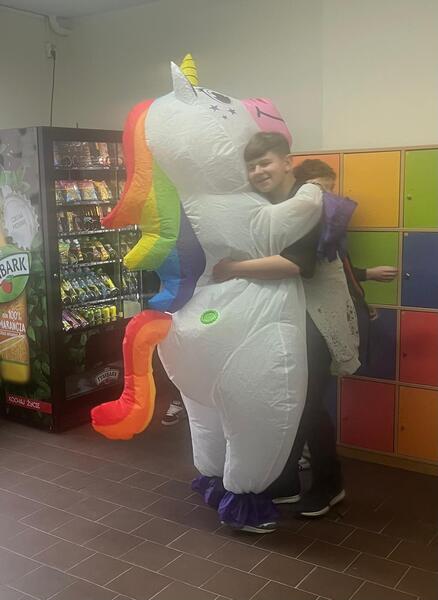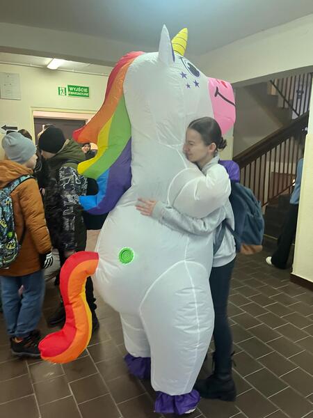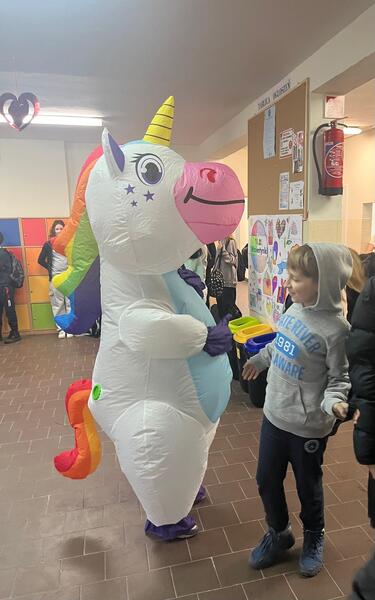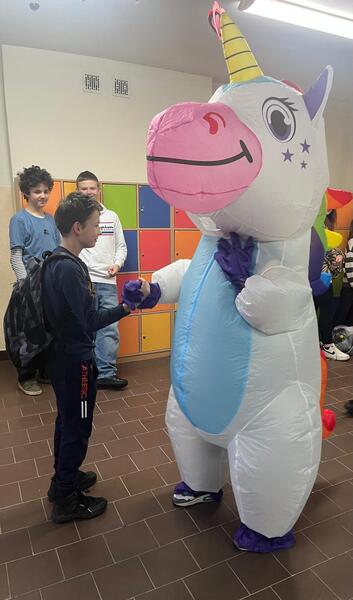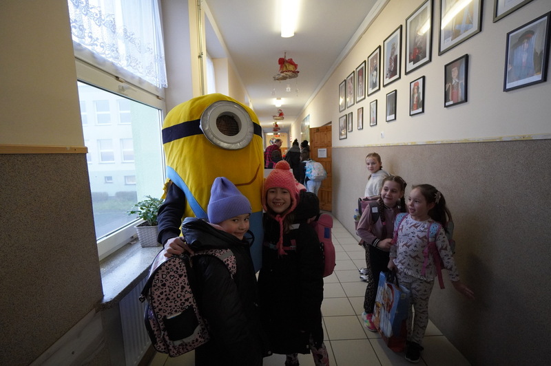 Dziś, w Tłusty Czwartek młodsze dzieci przywitał w szkole wielki Minionek, a starszą młodzież kolorowy Jednorożec. Można było dostać darmowy uścisk lub przybić piątkę. Miło było popatrzeć na uśmiechy wchodzących do szkoły uczniów. Mamy nadzieję, że ta niespodzianka wprawiła wszystkich w dobry nastrój i dała siłę na cały dzień.
