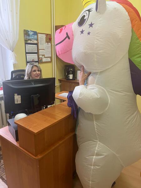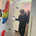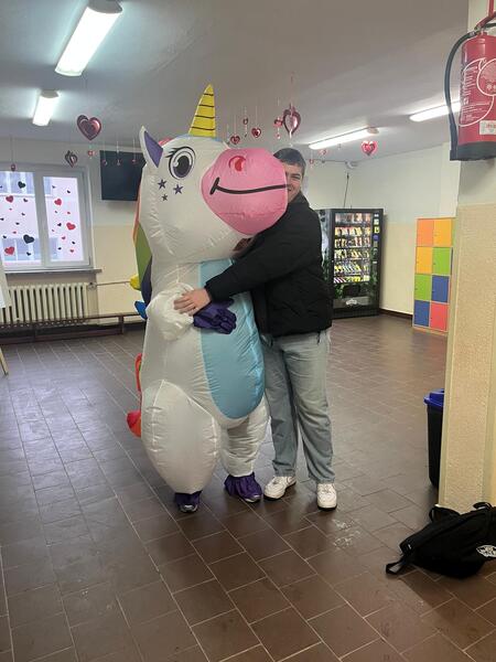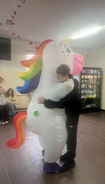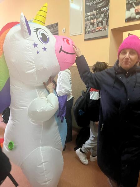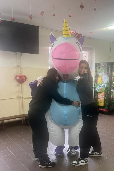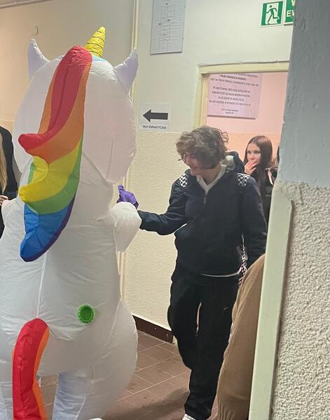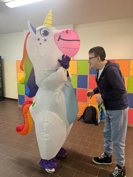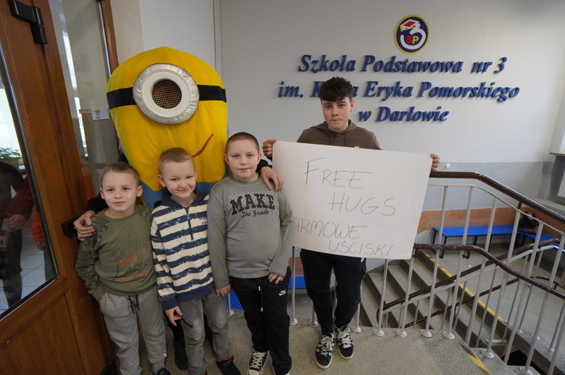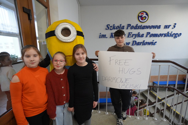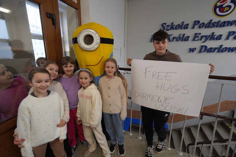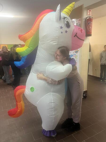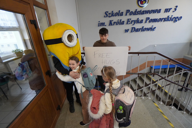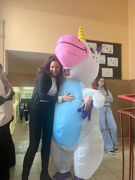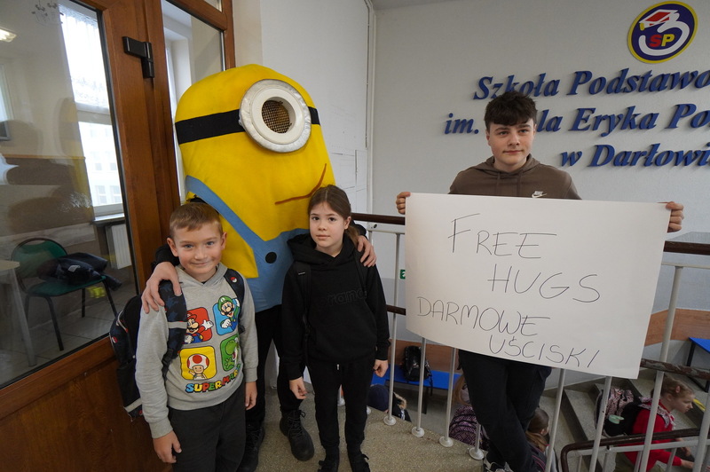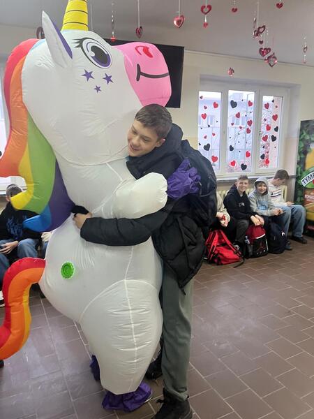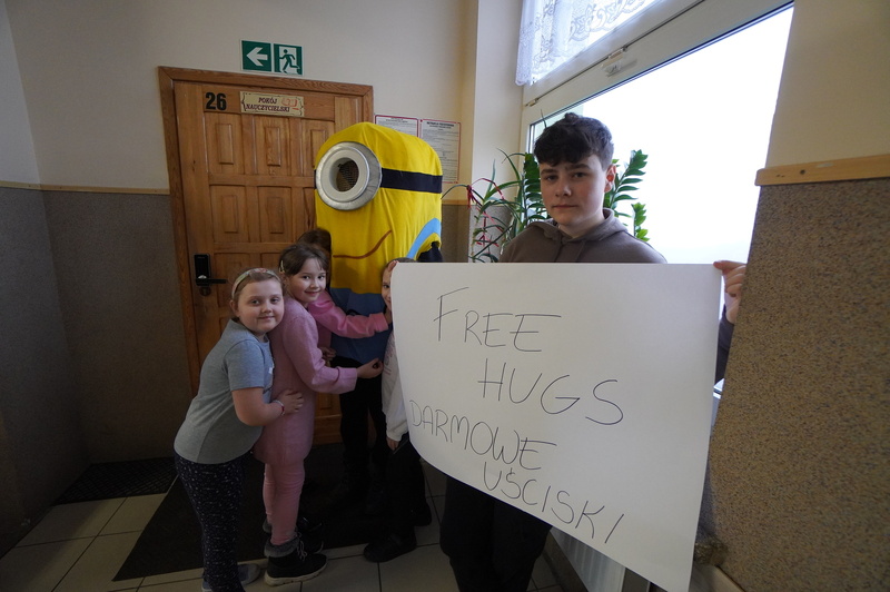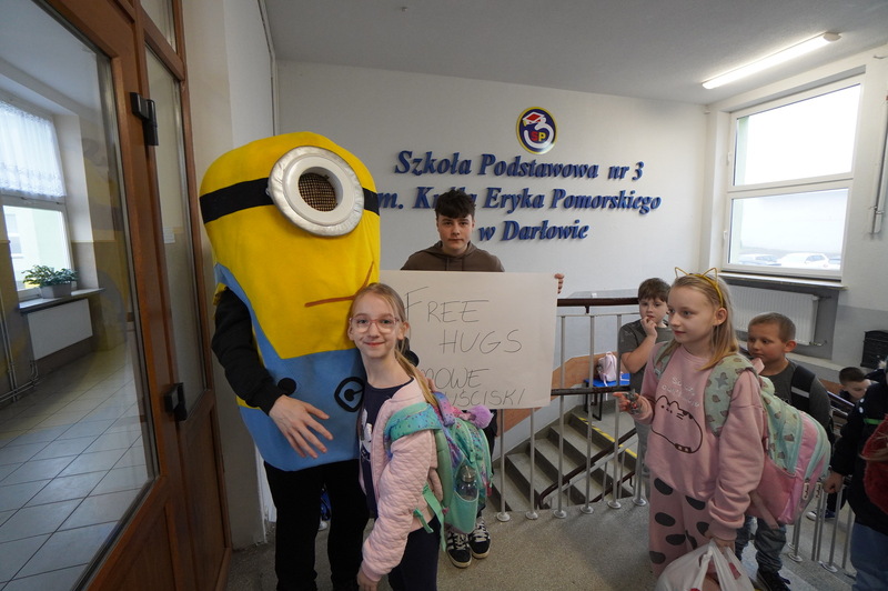 Dziś, w Tłusty Czwartek młodsze dzieci przywitał w szkole wielki Minionek, a starszą młodzież kolorowy Jednorożec. Można było dostać darmowy uścisk lub przybić piątkę. Miło było popatrzeć na uśmiechy wchodzących do szkoły uczniów. Mamy nadzieję, że ta niespodzianka wprawiła wszystkich w dobry nastrój i dała siłę na cały dzień.