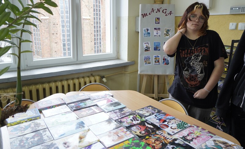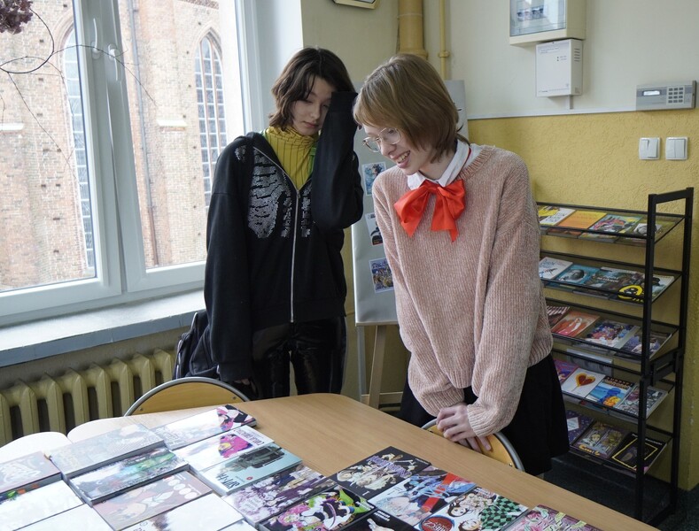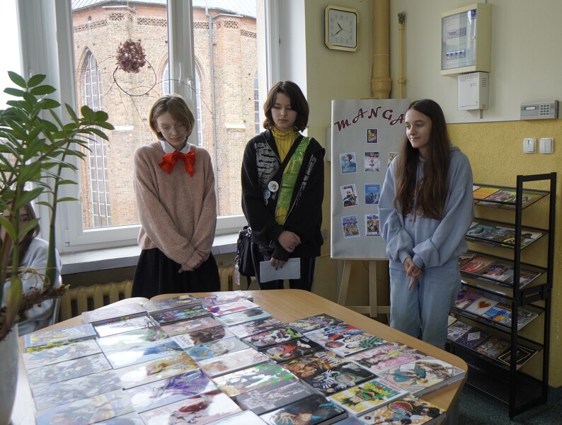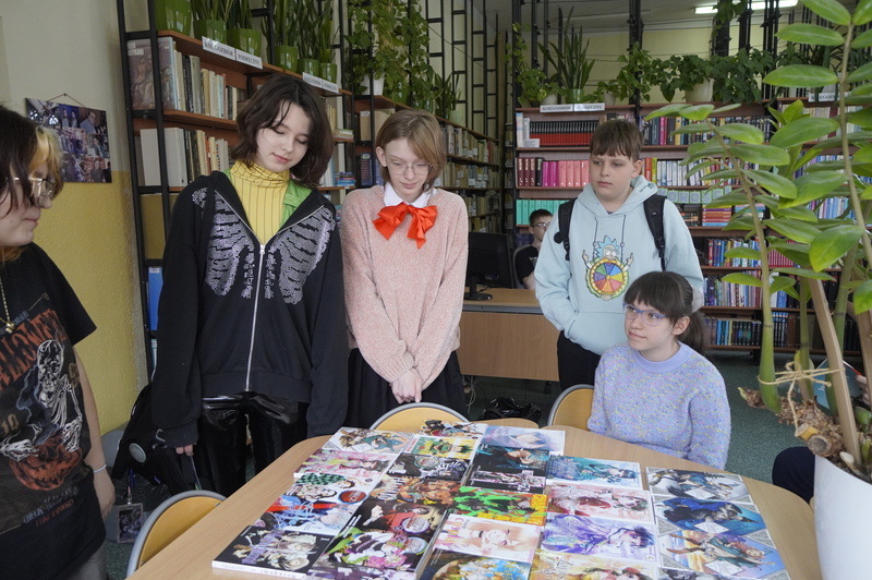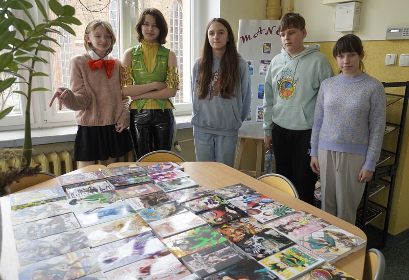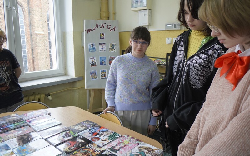 W poniedziałek (07.04.) odbyło się w bibliotece (budynek B) spotkanie miłośników mangi. Uczniowie przynieśli swoje ulubione japońskie komiksy, opowiadali o tytułowych bohaterach i powodach, dla których czytają mangi. Wyjaśnili też dlaczego mangę czyta się od prawej do lewej strony kartki. Manga staje się coraz bardziej popularna wśród młodzieży, więc uczestnicy akcji planują następne spotkanie.