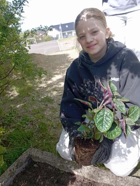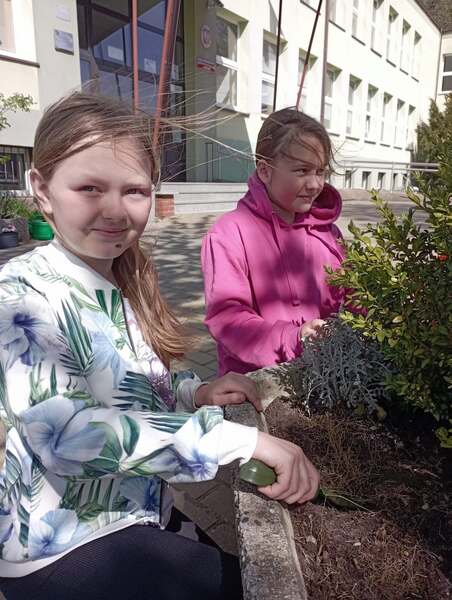 Uczniowie z koła przyrodniczego zasadzili wiosenne kwiaty na klombach przy wejściu do szkoły oraz krzewy owocowe i ozdobne w ogródku szkolnym. Z niecierpliwością czekamy na owoce malin i jagody kamczackiej. Dziękujemy Pani Grodz za sadzonki i pomoc w sadzeniu.