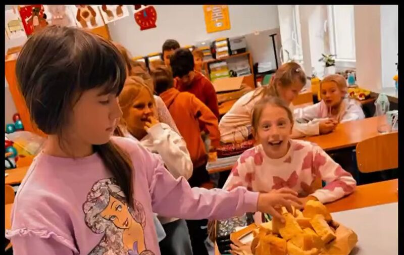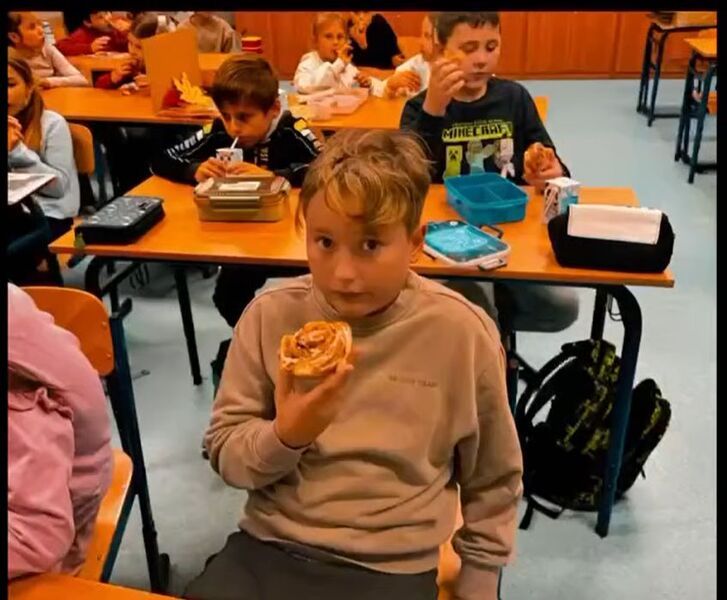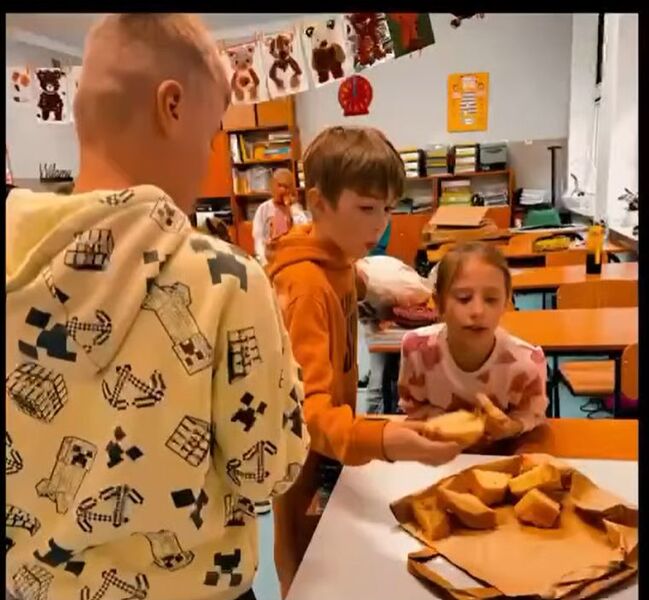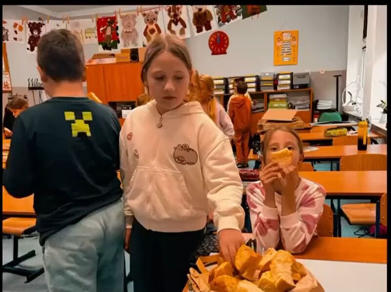 Zwieńczeniem lekcji był wspólny poczęstunek, który wywołał uśmiech na twarzach wszystkich uczestników. Na stołach pojawiły się aromatyczne cynamonki oraz domowy chleb, wypieczony specjalnie na tę okazję przez jedną z uczennic. Dzieci z apetytem kosztowały wypieków, dzieląc się wrażeniami i nowo zdobytą wiedzą.