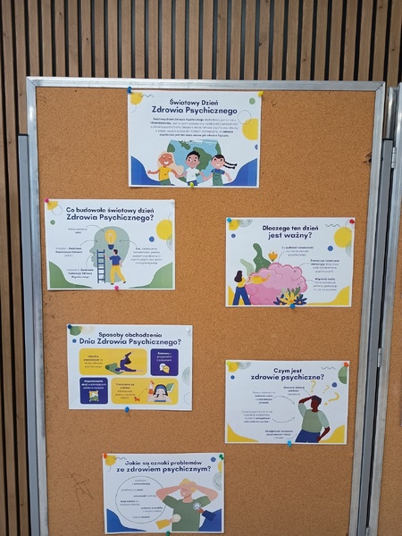 W budynku na ul. Szkolnej 12 na głównym korytarzu w szkole umieszczono gazetkę o zdrowiu psychicznym. Mogliśmy się z niej dowiedzieć jak dbać o zdrowie psychiczne i gdzie szukać pomocy, gdy jest trudno. Tego dnia uczennice rozdawały uczniom i nauczycielom „pozytywne myśli”, które sprawiły uśmiech wśród naszej społeczności i wiarę w swojej możliwości.