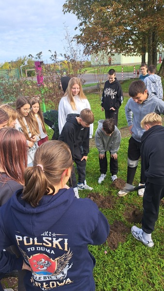 W październiku świętowaliśmy Dzień Drzewa. Nasze działania miały na celu zwiększenie świadomości uczniów, jak istotną rolę pełnią drzewa i inne rośliny w życiu i funkcjonowaniu naszej planety. Uczniowie klas 4 poznali drzewa i krzewy najbliższej okolicy. Wykonali prace, które w przyszłości pozwolą im rozpoznać dany gatunek. W szkolnym ogrodzie uczniowie kl 7 posadzili oczar, niezwykłą roślinę kwitnącą w okresie zimowym i wykorzystywaną w preparatach kosmetycznych ze względu na właściwości ściągające. Następnie, na lekcjach chemii, próbowali wyekstrahować olejki eteryczne znajdujące się w liściach mięty oraz rozdzielić barwniki roślinne. W tym celu wykorzystali poznane na lekcjach metody rozdziału mieszanin.