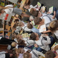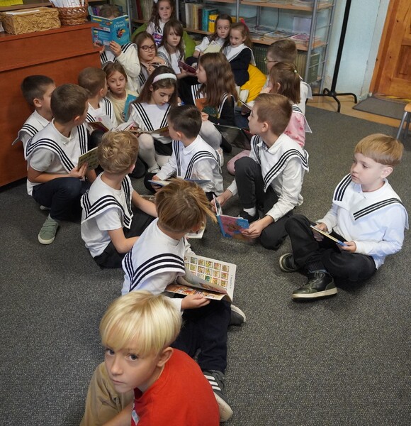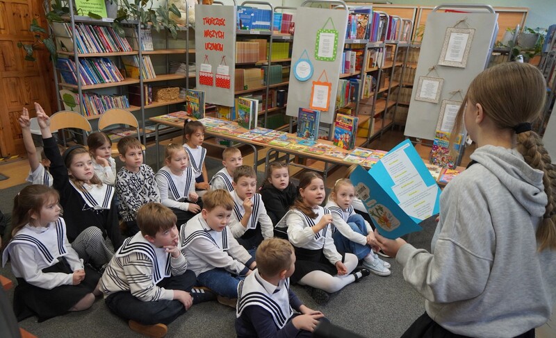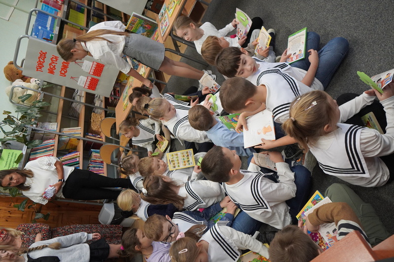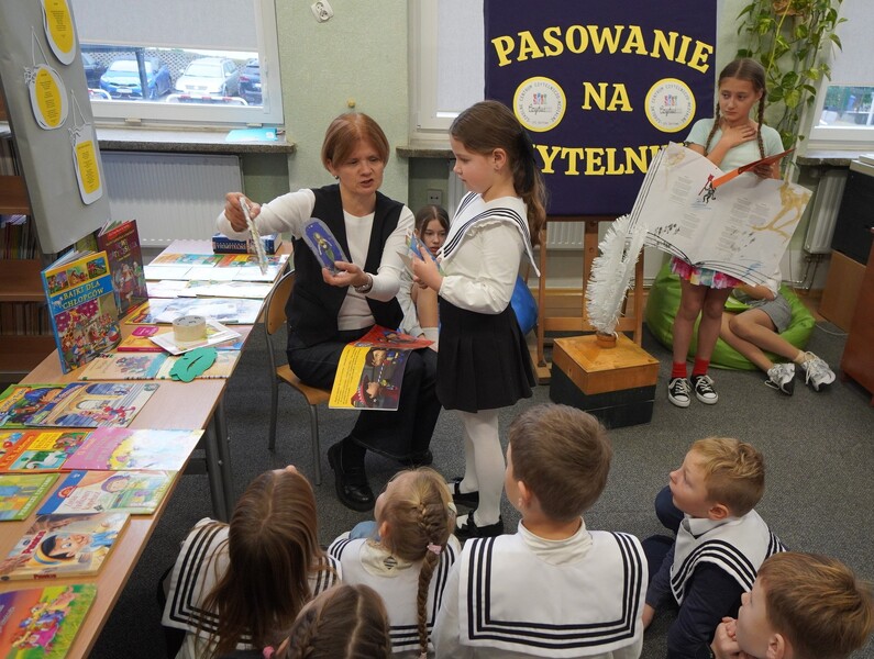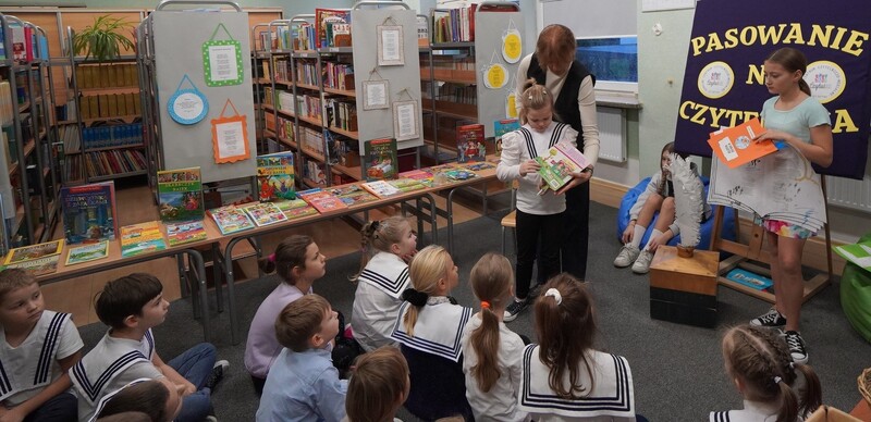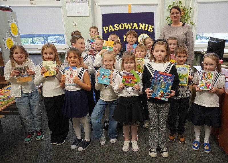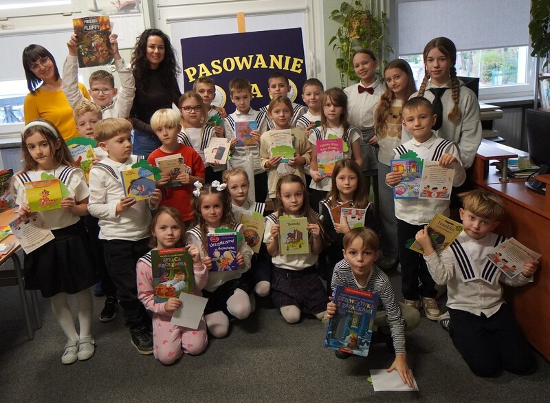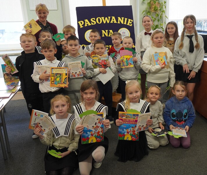 W dniach 17 – 20 listopada br. 83 pierwszoklasistów przyjętych zostało w poczet czytelników biblioteki szkolnej. W świat książek najmłodszych uczniów wprowadziły koleżanki z klasy VE. Nie obyło się również bez zagadek związanych z bajkami i baśniami. Następnie w obecności Pani Wicedyrektor Justyny Tomczyk i Wychowawców uczniowie przyrzekli, że będą szanować książki i korzystać z ich mądrości oraz sumiennie wypełniać obowiązki czytelnika. Każde dziecko zostało uroczyście pasowane symbolicznym piórem, stając się czytelnikiem biblioteki szkolnej. Na pamiątkę uczniowie otrzymali certyfikat złożonego przyrzeczenia i zakładkę do książki.