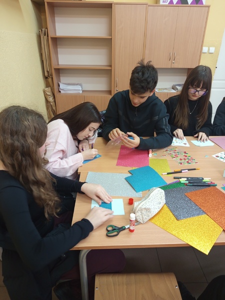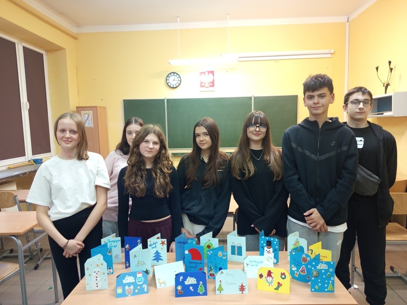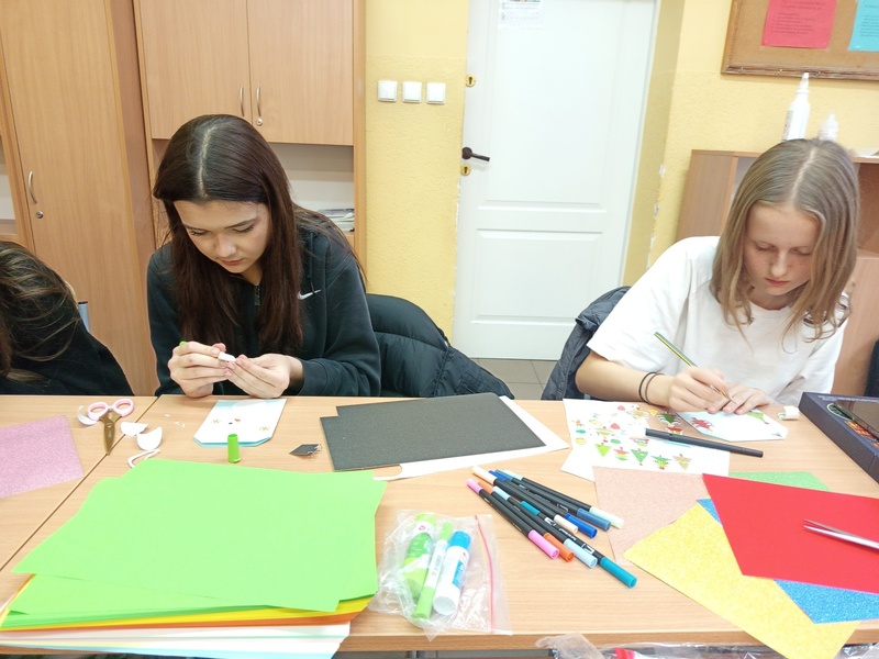 Dnia 09 grudnia 2025 roku wolontariusze ze Szkolnego Klubu Wolontariusza „Pomocna dłoń” przygotowali kartki świąteczne, które zostaną przekazane dla pensjonariuszy hospicjum.