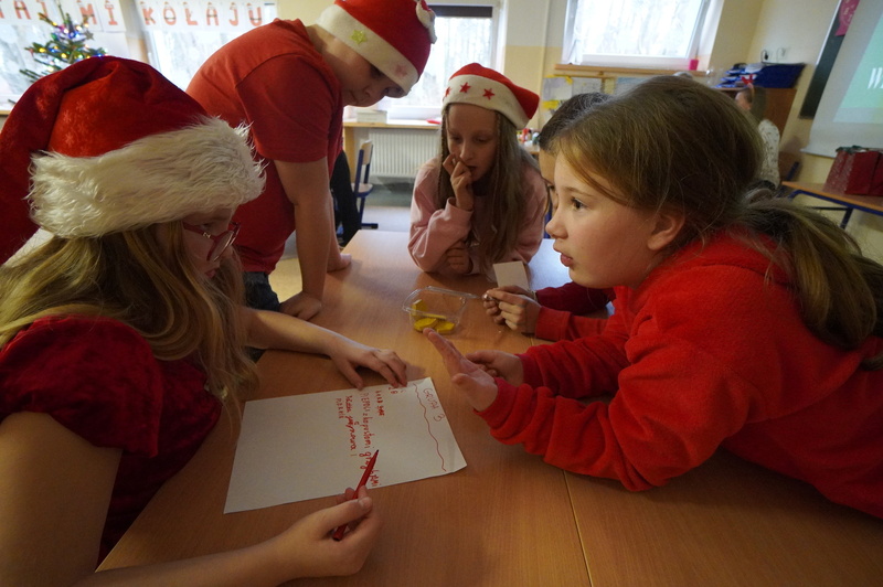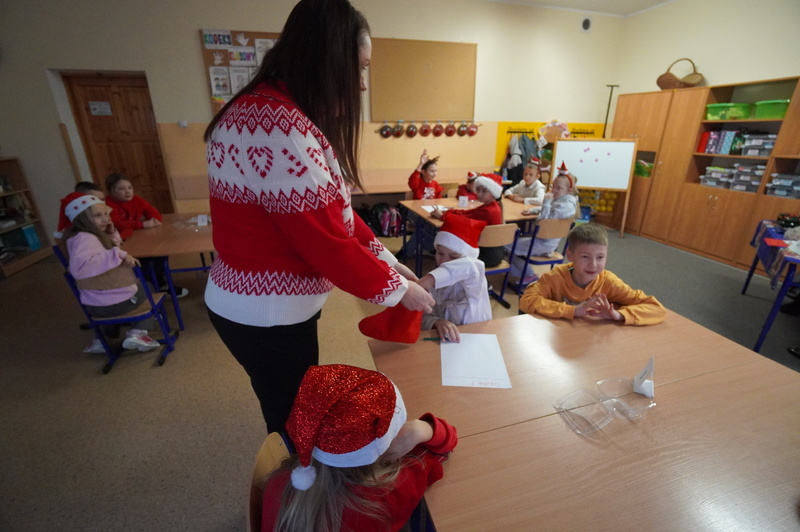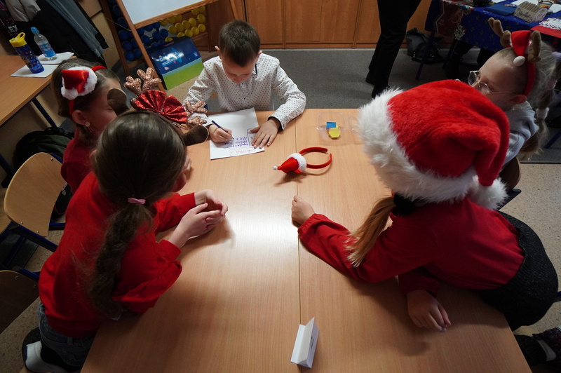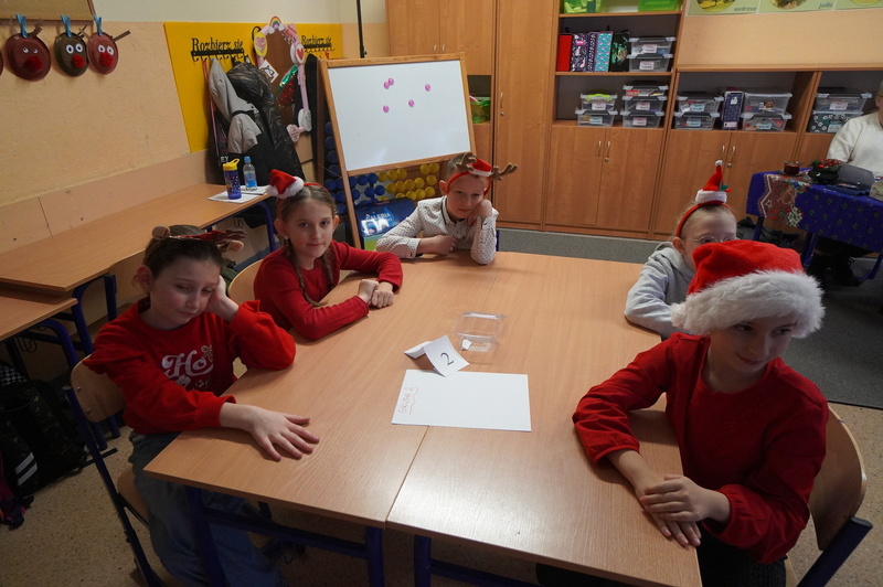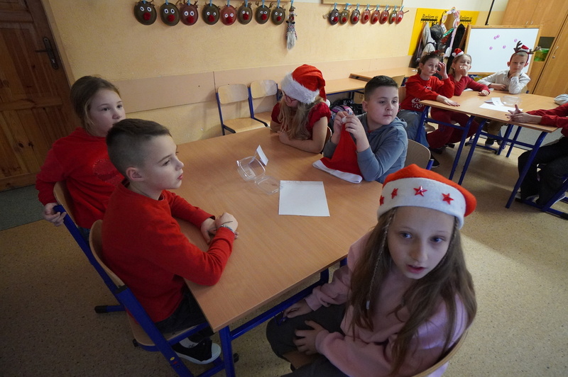 Zadania wykonywali z dużym zaangażowaniem, a należało np.: zapakować świąteczny prezent, ułożyć życzenia świąteczne z rozsypanki wyrazowej, wykonać najdłuższy łańcuch na choinkę, także wykazać się znajomością tradycyjnych potraw świątecznych i kolęd. Podczas pracy było dużo zabawy i dobrych emocji.