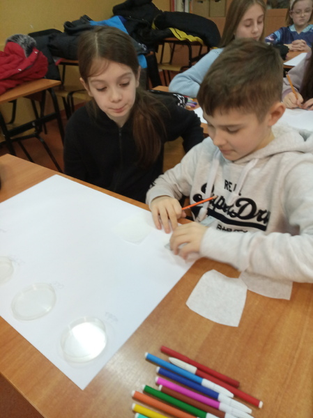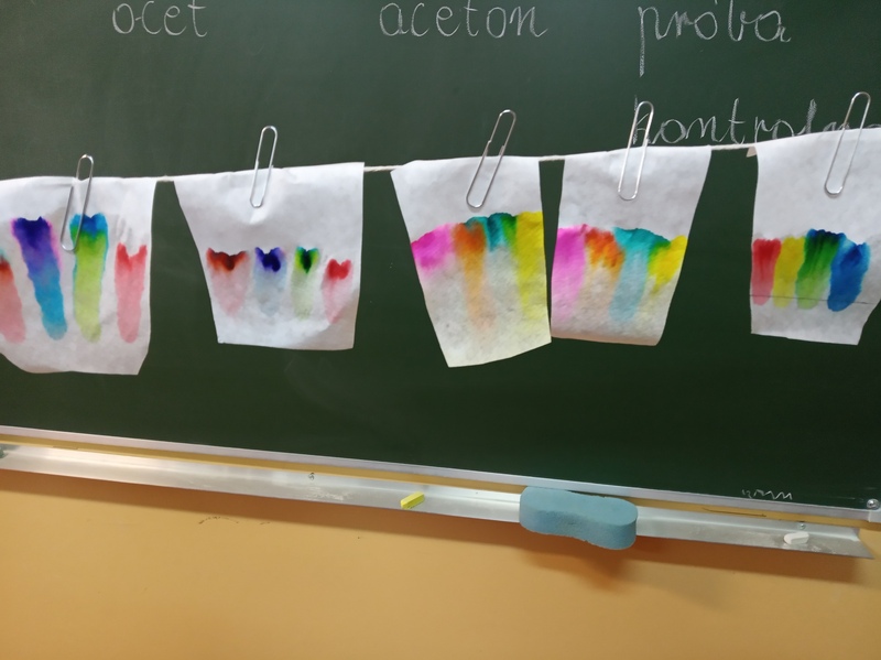 Jednym z doświadczeń przeprowadzonym na zajęciach koła przyrodniczego poświęconych eksperymentom, było doświadczenie wyjaśniające, na czym polega chromatografia bibułowa. Taką metodę badawczą stosuje się głównie w laboratoriach analitycznych, farmaceutycznych lub kryminalistycznych. Dzięki chromatografii możliwe jest rozdzielenie mieszanin złożonych z wielu składników. Chromatografia polega na przepuszczeniu mieszaniny przez ośrodek, w którym poszczególne składniki mieszaniny wędrują z różnymi prędkościami i dzięki temu zostają rozdzielone. Uczniowie po przeprowadzonych doświadczeniach i obserwacjach doszli do wniosku, iż mazak jednego koloru składa się tak naprawdę z 3-4 barwników, które przemieszczają się po bibule z różną szybkością, w zależności od koloru barwników. Efekty pokazujące złożoność barw różnych mazaków okazały się  bajecznie kolorowe.