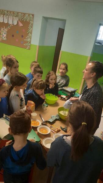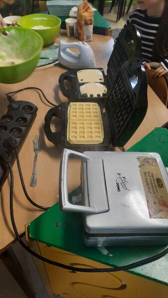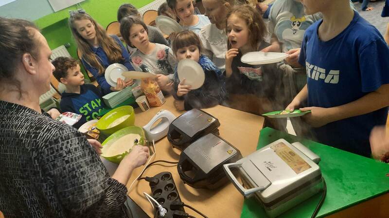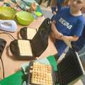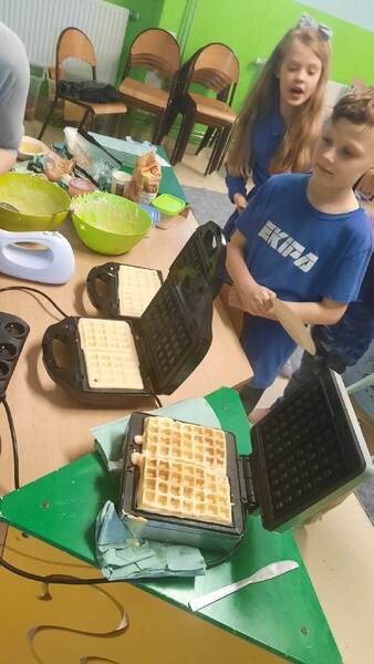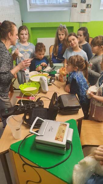 Podczas zajęć dzieci poznały pochodzenie gofrów, sposoby ich przyrządzania i podawania. Uczestnicy warsztatów uczestniczyli w przygotowaniu ciasta na gofry i z niecierpliwością oczekiwali na ich upieczenie.