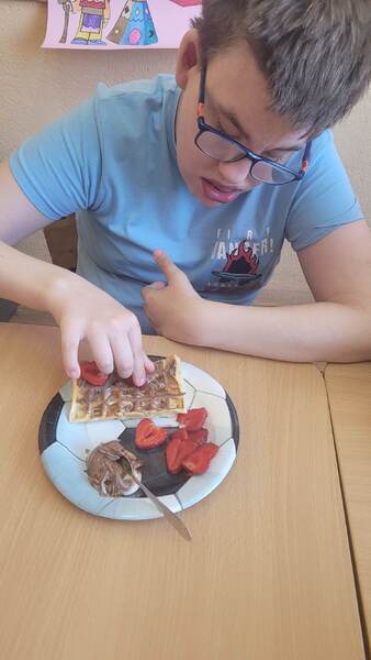 14.06.2023r. w ramach innowacji pedagogicznej „Kuchcikowo-kulinarne a,b,c” Ola, Magda, Mikołaj, Mateusz i Wiktor przygotowali pyszne gofry, które udekorowali truskawkami.