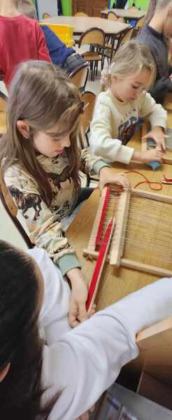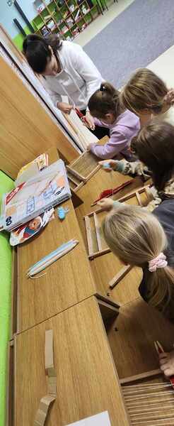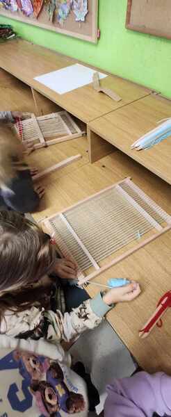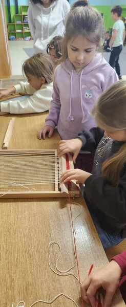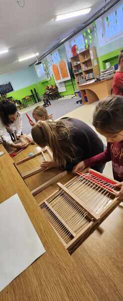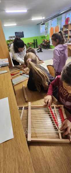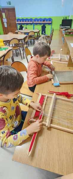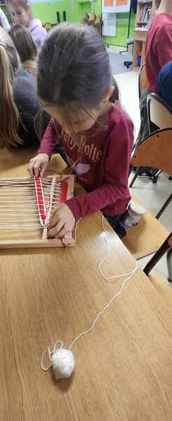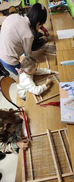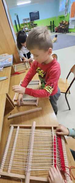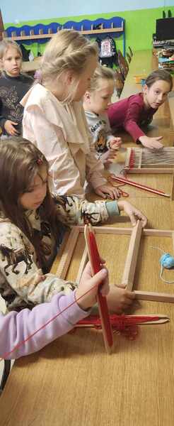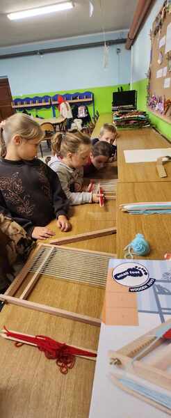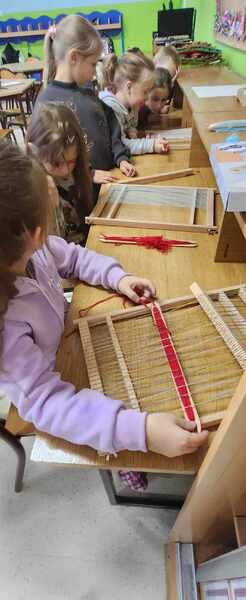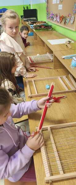 W świetlicy szkolnej odbyły się zajęcia z tkania na krośnie. Uczniowie poznali budowę krosna, następnie uczyli się naciągać osnowę, aby potem wykonać prosty ścieg. Dzieci wykazały się dokładnością, pracowitością ale przede wszystkim wielkim zainteresowaniem. To było bardzo ciekawe doświadczenie.
